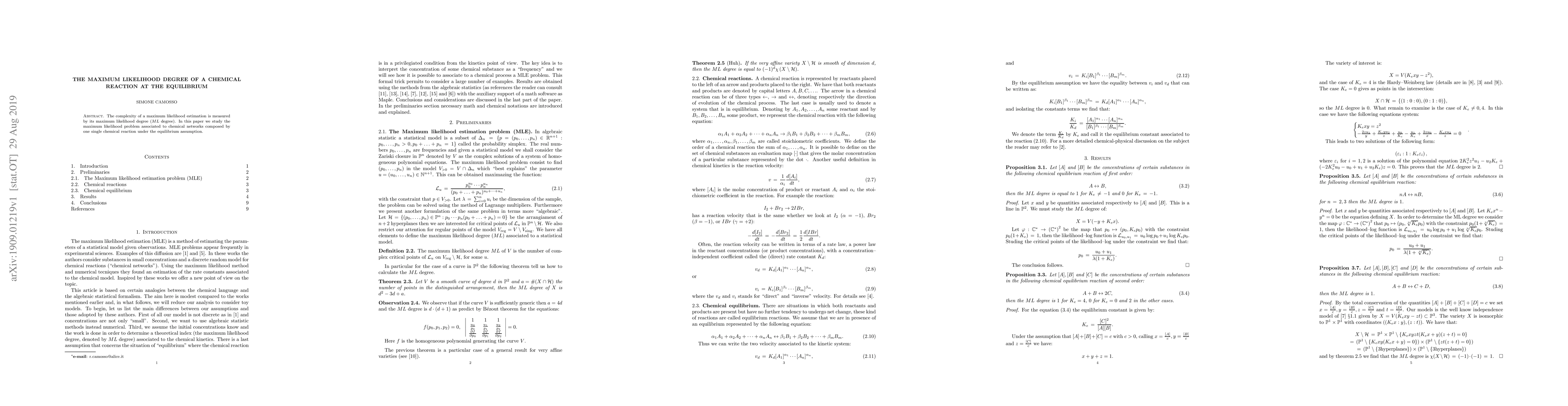 This paper investigates the maximum likelihood degree ($ML$ degree) for estimating the complexity of chemical networks with a single reaction at equilibrium, focusing on the maximum likelihood estimation problem.
