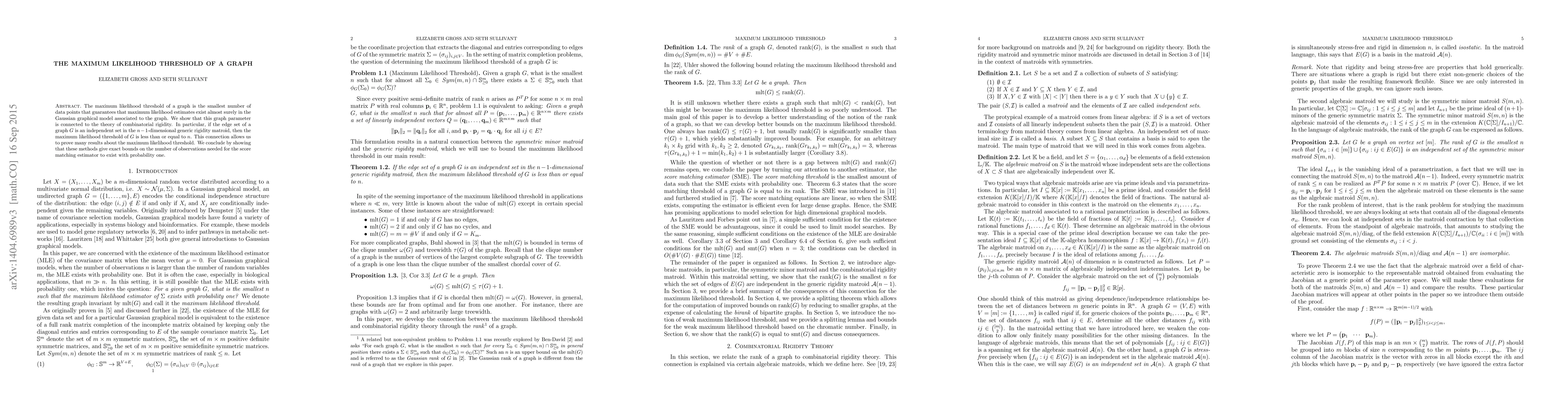A novel theoretical approach to derive the maximum likelihood threshold for Gaussian graphical models, based on combinatorial rigidity theory.
