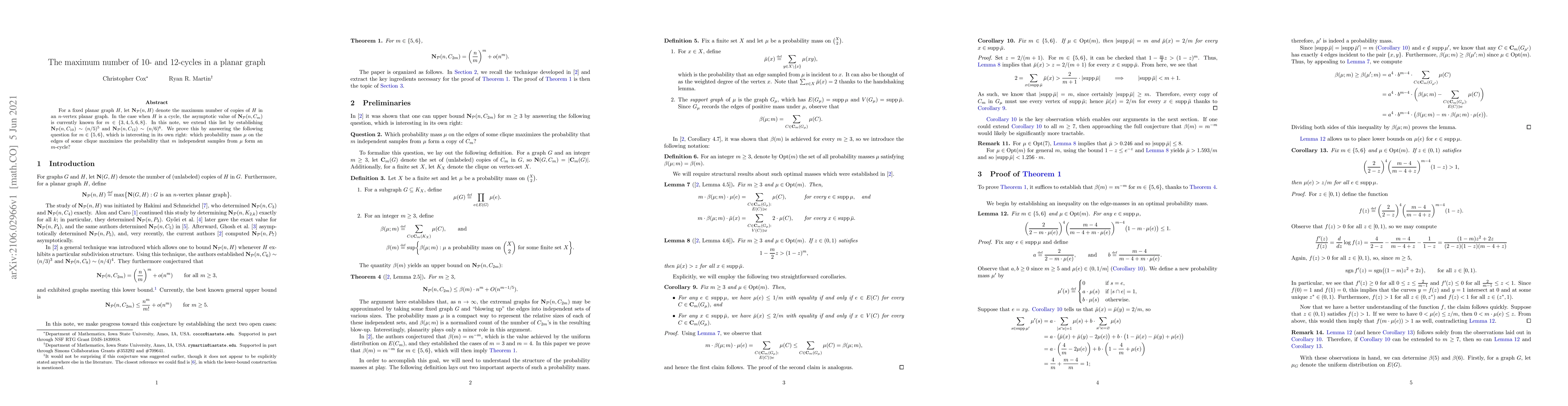 For a fixed planar graph $H$, let $\operatorname{\mathbf{N}}_{\mathcal{P}}(n,H)$ denote the maximum number of copies of $H$ in an $n$-vertex planar graph. In the case when $H$ is a cycle, the asymptotic value of $\operatorname{\mathbf{N}}_{\mathcal{P}}(n,C_m)$ is currently known for $m\in\{3,4,5,6,8\}$. In this note, we extend this list by establishing $\operatorname{\mathbf{N}}_{\mathcal{P}}(n,C_{10})\sim(n/5)^5$ and $\operatorname{\mathbf{N}}_{\mathcal{P}}(n,C_{12})\sim(n/6)^6$. We prove this by answering the following question for $m\in\{5,6\}$, which is interesting in its own right: which probability mass $\mu$ on the edges of some clique maximizes the probability that $m$ independent samples from $\mu$ form an $m$-cycle?