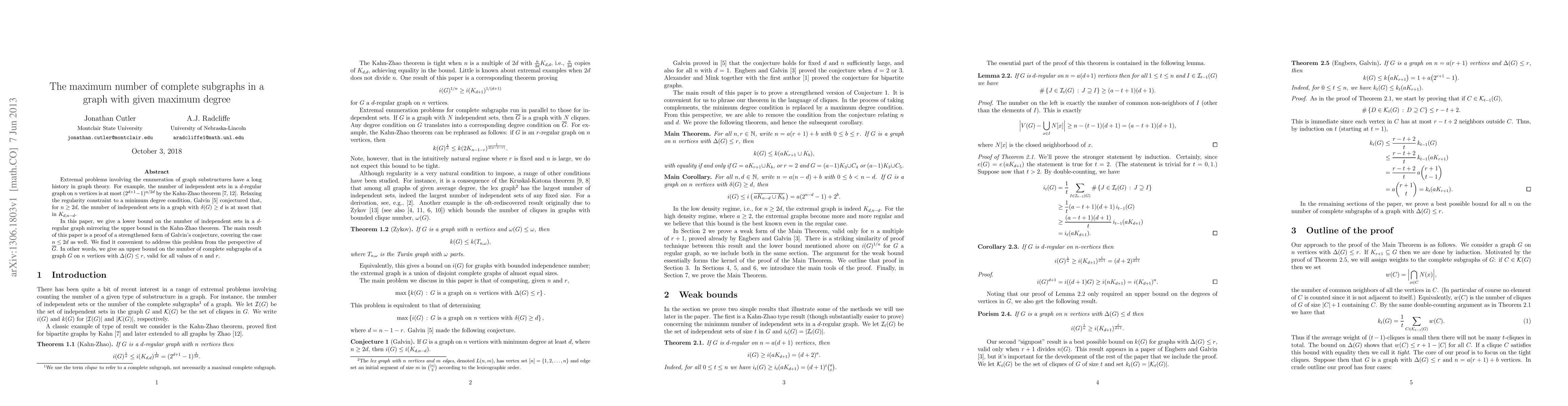 Extremal problems involving the enumeration of graph substructures have a long history in graph theory. For example, the number of independent sets in a $d$-regular graph on $n$ vertices is at most $(2^{d+1}-1)^{n/2d}$ by the Kahn-Zhao theorem. Relaxing the regularity constraint to a minimum degree condition, Galvin conjectured that, for $n\geq 2d$, the number of independent sets in a graph with $\delta(G)\geq d$ is at most that in $K_{d,n-d}$. In this paper, we give a lower bound on the number of independent sets in a $d$-regular graph mirroring the upper bound in the Kahn-Zhao theorem. The main result of this paper is a proof of a strengthened form of Galvin's conjecture, covering the case $n\leq 2d$ as well. We find it convenient to address this problem from the perspective of $\complement{G}$. In other words, we give an upper bound on the number of complete subgraphs of a graph $G$ on $n$ vertices with $\Delta(G)\leq r$, valid for all values of $n$ and $r$.
