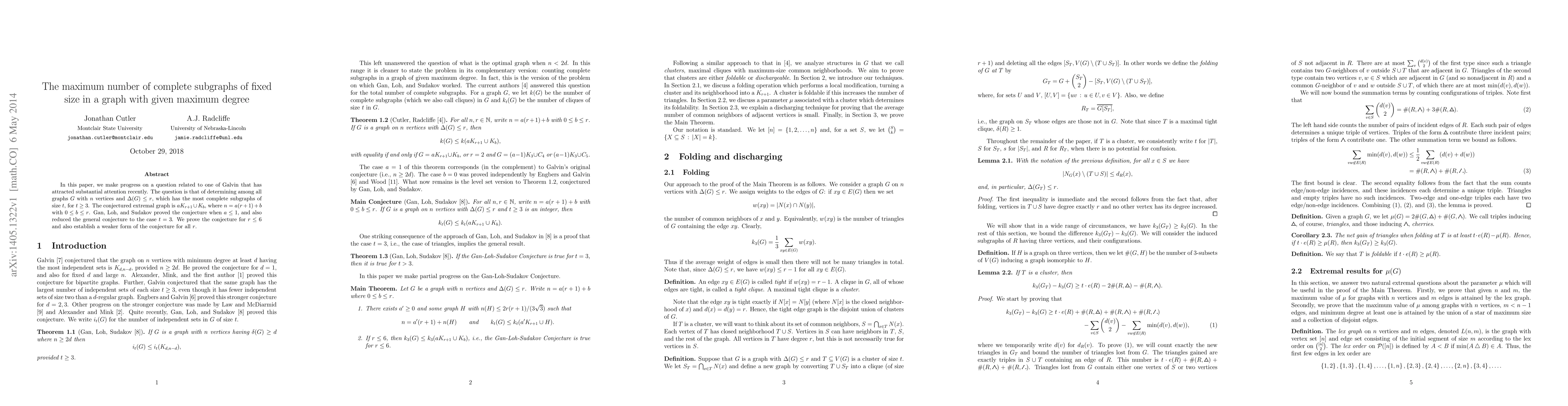 This paper proves that among graphs with n vertices and maximum degree r, the extremal graph for having the most complete subgraphs of size t is a specific configuration involving a complete graph K_{r+1} and another graph K_b. The proof covers the cases for r <= 6 and establishes a weaker form for all r.