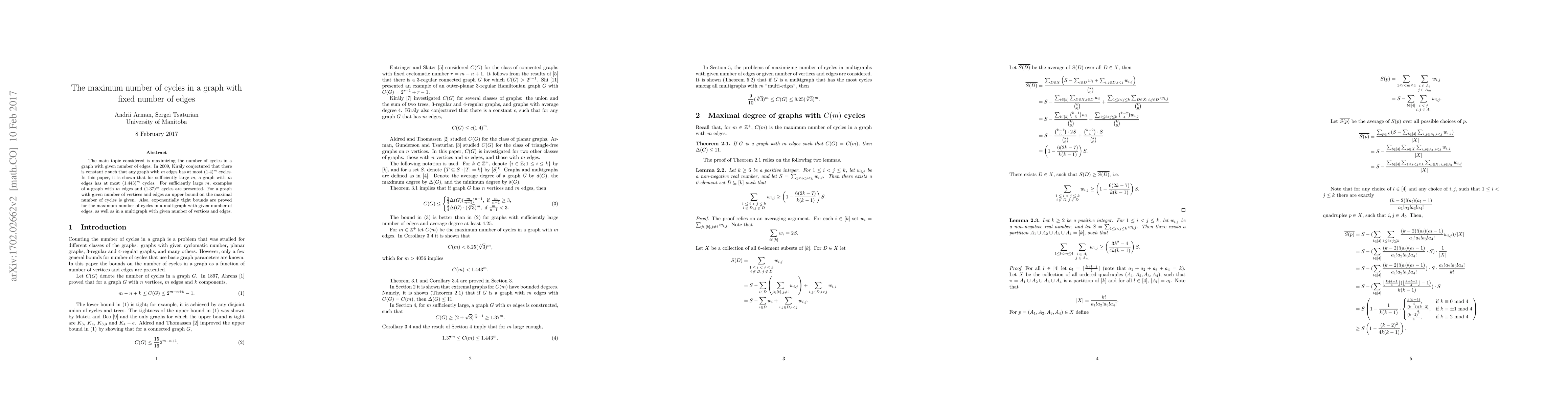 This paper investigates the maximum number of cycles in graphs with a fixed number of edges, proving that for large $m$, graphs have at most $(1.443)^m$ cycles, improving on a previous conjecture. It also provides examples of graphs achieving $(1.37)^m$ cycles and establishes upper bounds for graphs with fixed vertices and edges, as well as tight bounds for multigraphs.