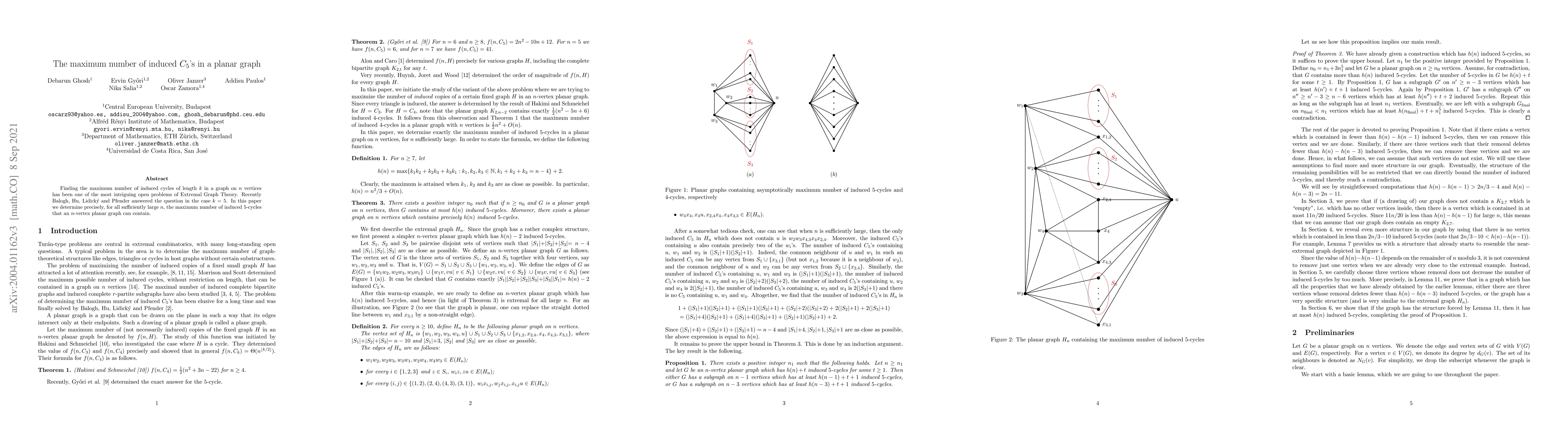 The paper determines that for sufficiently large n, a planar graph with n vertices can contain up to 8 induced C_5 cycles.