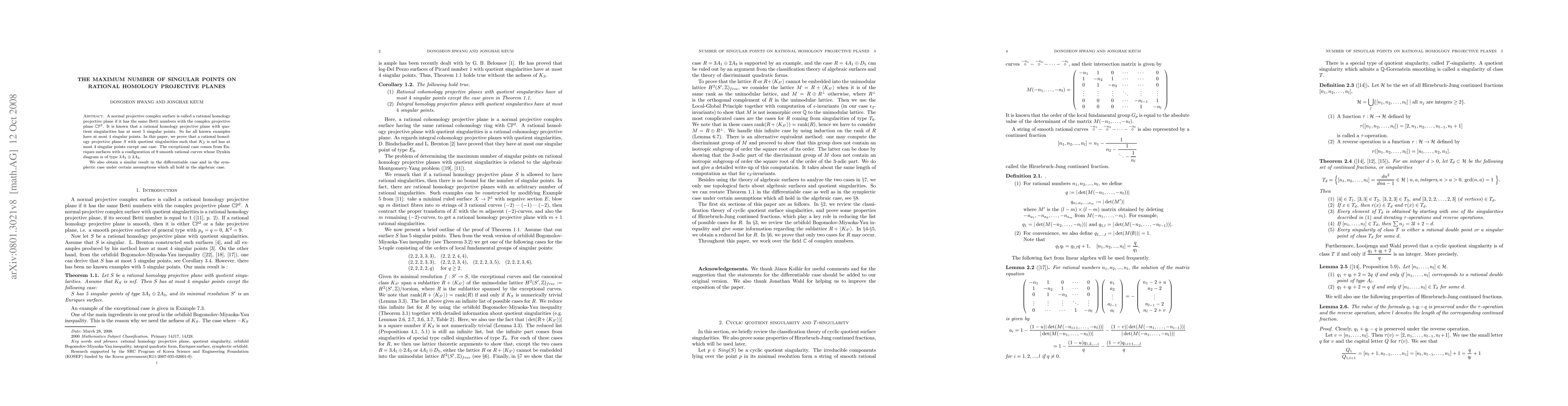 This paper proves that a rational homology projective plane with nef canonical divisor and quotient singularities generally has at most 4 singular points, with an exception arising from a specific configuration of Enriques surfaces. Similar results are obtained in the differentiable and symplectic cases under certain assumptions.