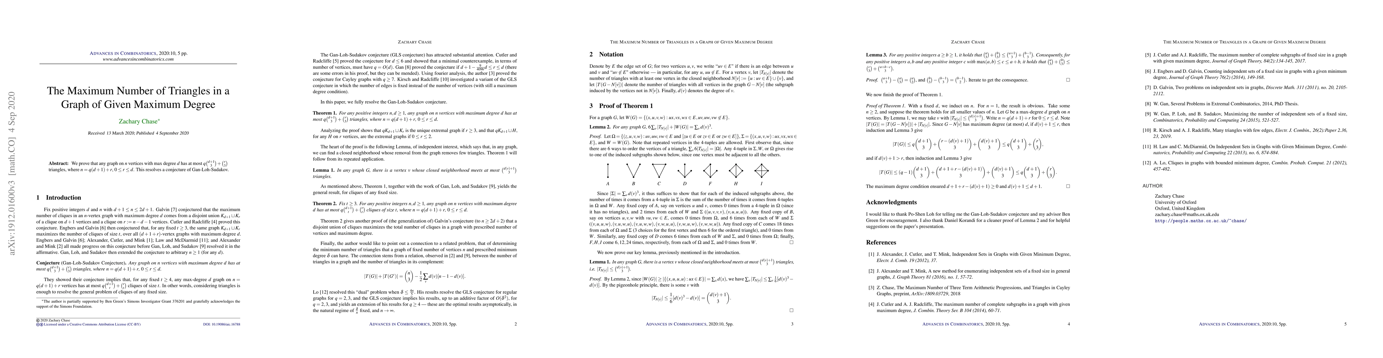 A research paper proves a limit on the number of triangles in a graph with a maximum degree d, finding that it is at most q(d+1 choose 3) + r choose 3 triangles, resolving a conjecture.