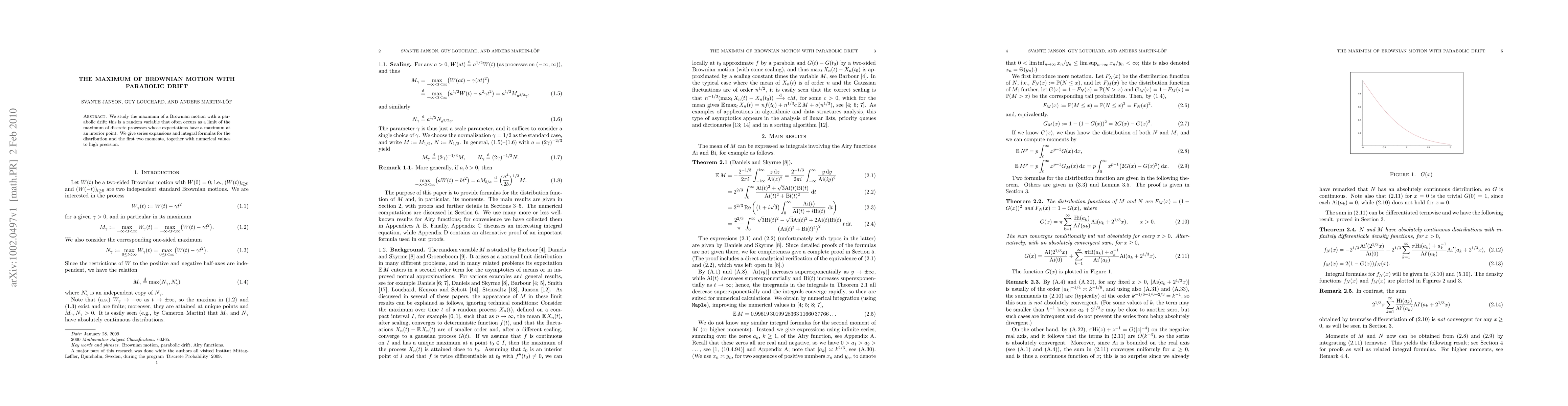 This paper investigates the maximum of a Brownian motion with a parabolic drift, providing series expansions and integral formulas for its distribution and first two moments, along with high-precision numerical values. The study focuses on a random variable that emerges as a limit of discrete processes with interior maximum expectations.