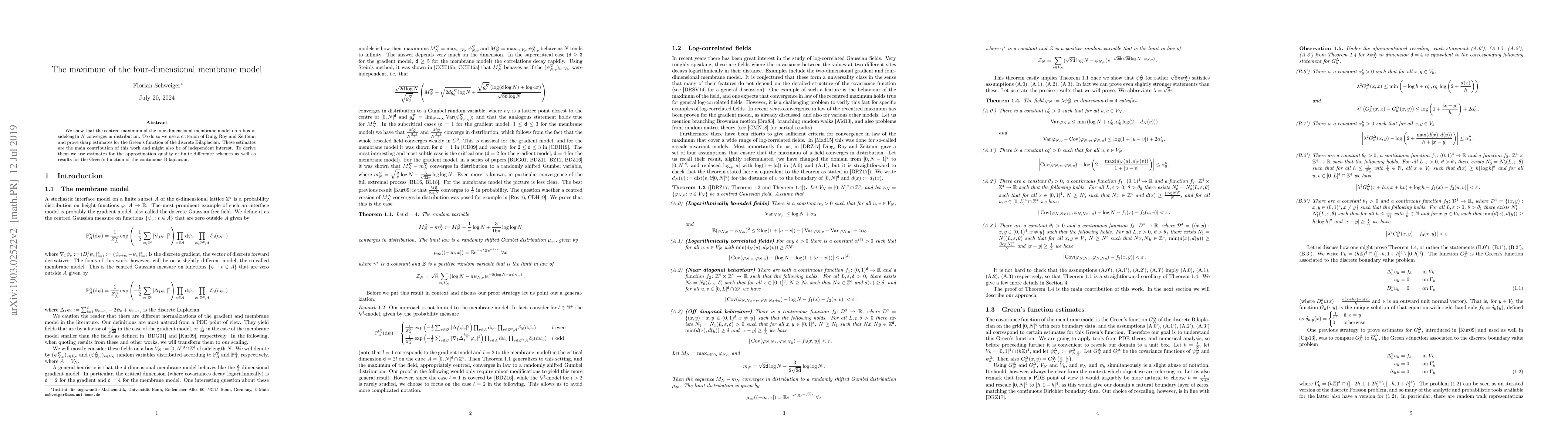 We show that the centred maximum of the four-dimensional membrane model on a box of sidelength $N$ converges in distribution. To do so we use a criterion of Ding, Roy and Zeitouni and prove sharp estimates for the Green's function of the discrete Bilaplacian. These estimates are the main contribution of this work and might also be of independent interest. To derive them we use estimates for the approximation quality of finite difference schemes as well as results for the Green's function of the continuous Bilaplacian.