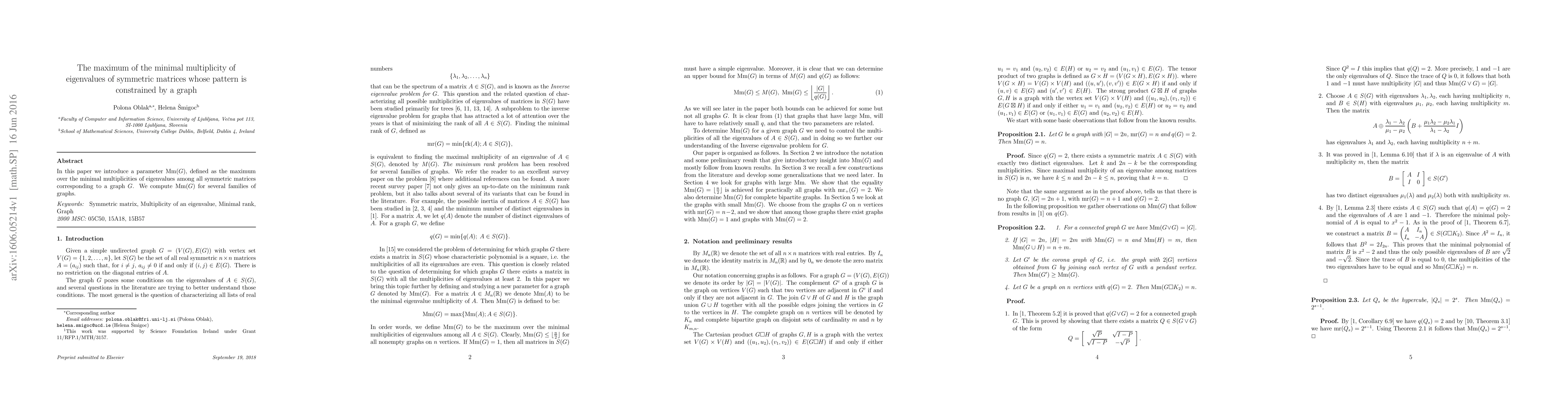 The paper introduces a parameter $Mm(G)$, defined as the maximum over the minimal multiplicities of eigenvalues among all symmetric matrices corresponding to a graph $G$. It computes $Mm(G)$ for several families of graphs, including those with small minimal rank and complete bipartite graphs.