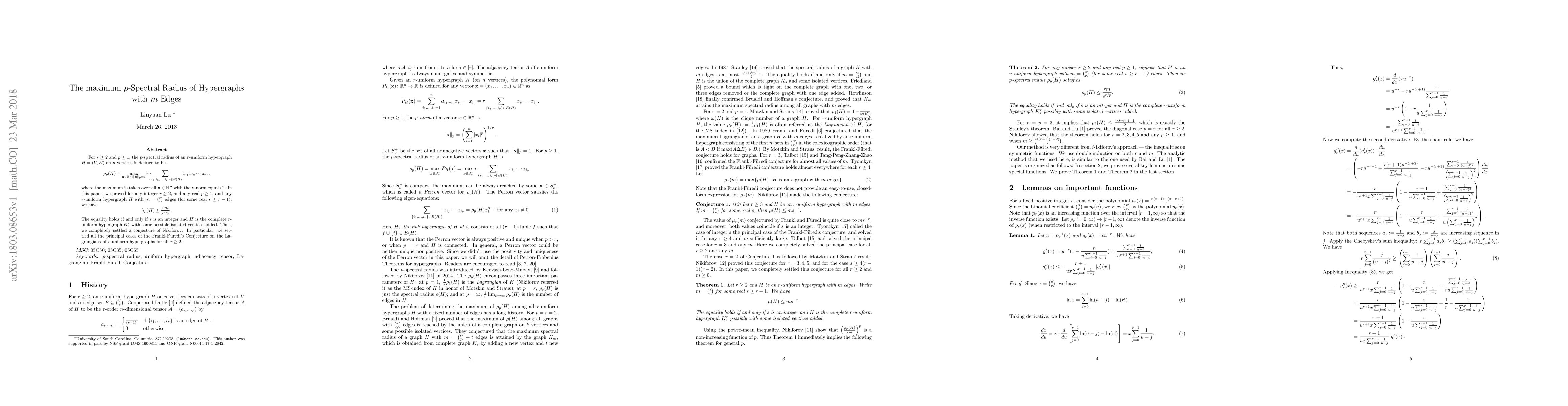 For $r\geq 2$ and $p\geq 1$, the $p$-spectral radius of an $r$-uniform hypergraph $H=(V,E)$ on $n$ vertices is defined to be $$\rho_p(H)=\max_{{\bf x}\in \mathbb{R}^n: \|{\bf x}\|_p=1}r \cdot \!\!\!\! \sum_{\{i_1,i_2,\ldots, i_r\}\in E(H)} x_{i_1}x_{i_2}\cdots x_{i_r},$$ where the maximum is taken over all ${\bf x\in \mathbb{R}^n}$ with the $p$-norm equals 1. In this paper, we proved for any integer $r\geq 2$, and any real $p\geq 1$, and any $r$-uniform hypergraph $H$ with $m={s\choose r}$ edges (for some real $s\geq r-1$), we have $$\lambda_p(H)\leq \frac{rm}{s^{r/p}}.$$ The equality holds if and only if $s$ is an integer and $H$ is the complete $r$-uniform hypergraph $K^r_s$ with some possible isolated vertices added. Thus, we completely settled a conjecture of Nikiforov. In particular, we settled all the principal cases of the Frankl-F\"{u}redi's Conjecture on the Lagrangians of $r$-uniform hypergraphs for all $r\geq 2$.