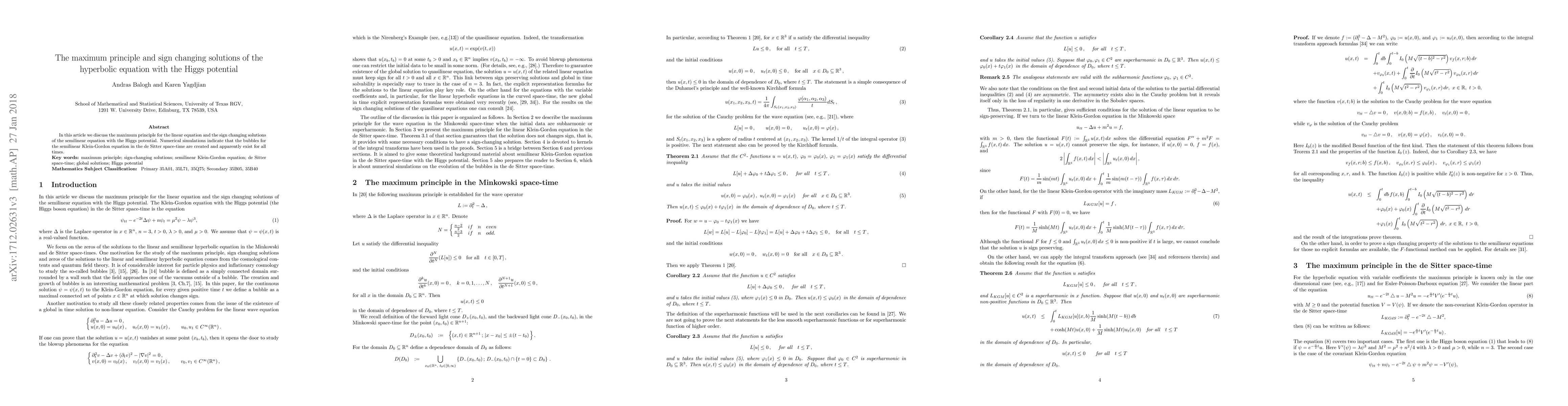 In this article we discuss the maximum principle for the linear equation and the sign changing solutions of the semilinear equation with the Higgs potential. Numerical simulations indicate that the bubbles for the semilinear Klein-Gordon equation in the de Sitter spacetime are created and apparently exist for all times.