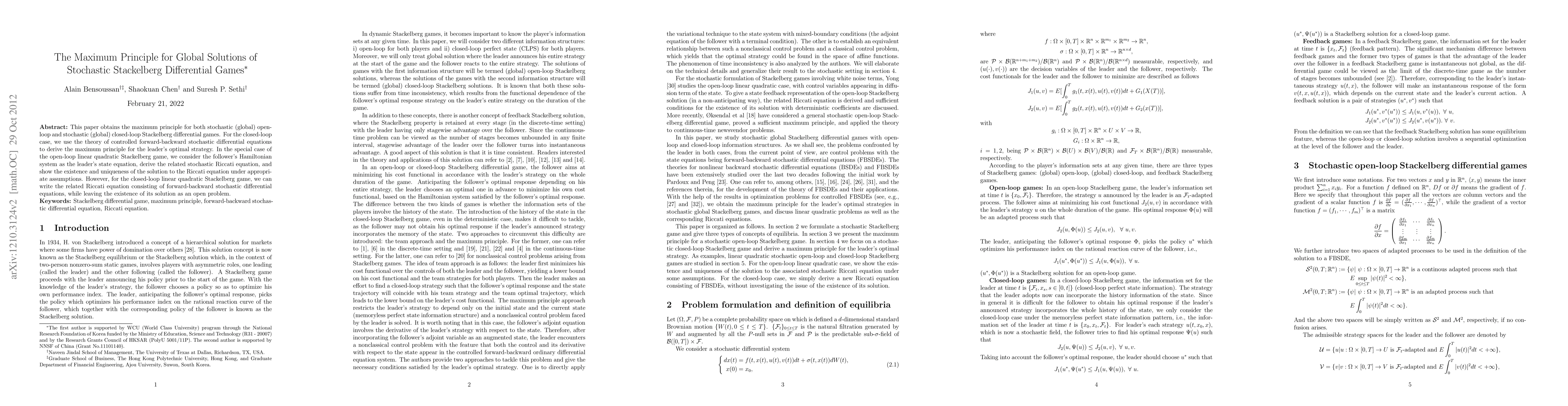 This paper obtains the maximum principle for both stochastic (global) open-loop and stochastic (global) closed-loop Stackelberg differential games. For the closed-loop case, we use the theory of controlled forward-backward stochastic differential equations to derive the maximum principle for the leader's optimal strategy. In the special case of the open-loop linear quadratic Stackelberg game, we consider the follower's Hamiltonian system as the leader's state equation, derive the related stochastic Riccati equation, and show the existence and uniqueness of the solution to the Riccati equation under appropriate assumptions. However, for the closed-loop linear quadratic Stackelberg game, we can write the related Riccati equation consisting of forward-backward stochastic differential equations, while leaving the existence of its solution as an open problem.