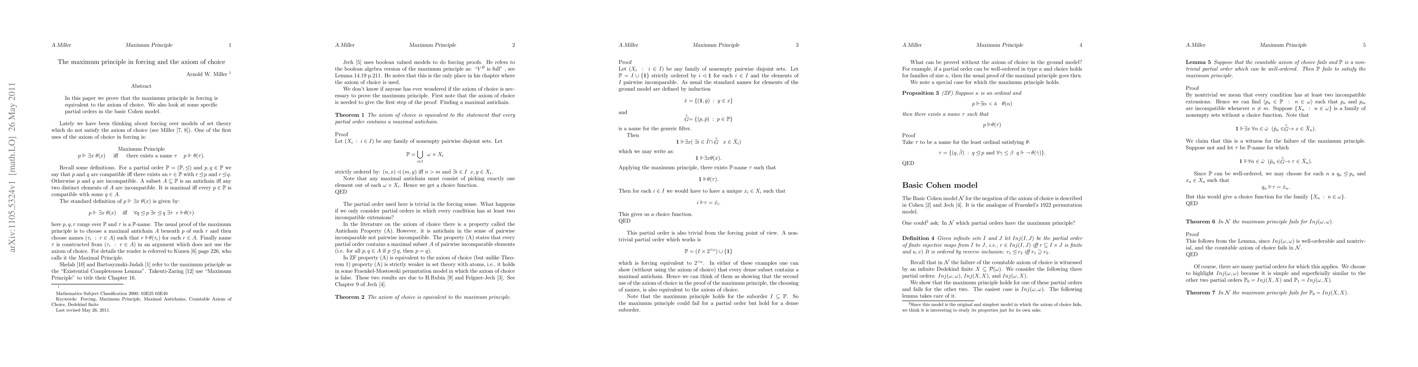 This paper demonstrates the equivalence between the maximum principle in forcing and the axiom of choice. It also examines three partial orders in the Basic Cohen model, revealing that only one of them upholds the maximum principle despite their apparent similarities.
