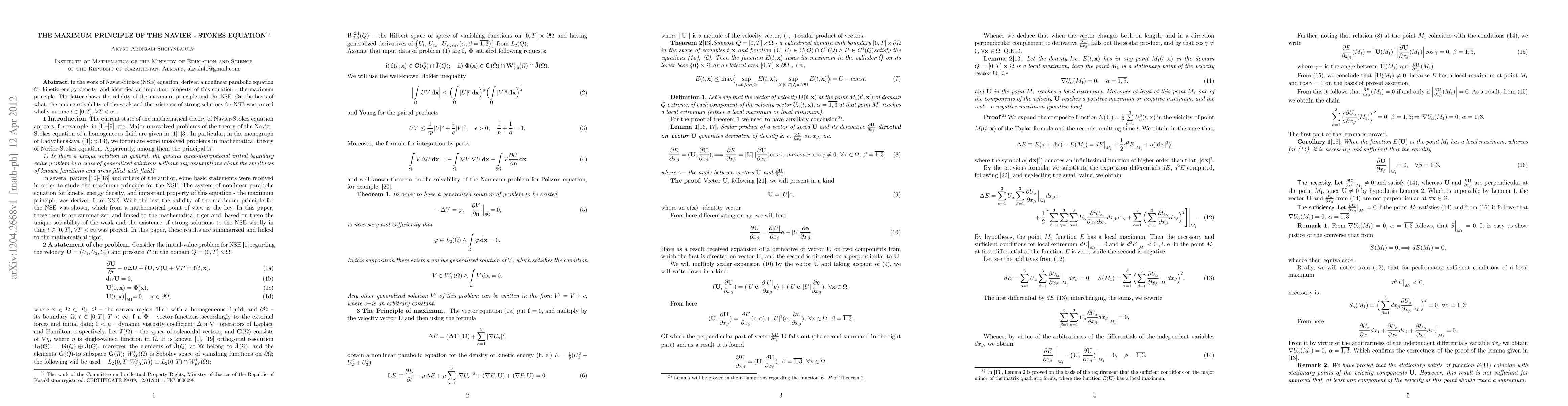 In the work of Navier-Stokes (NSE) equation, derived a nonlinear parabolic equation for kinetic energy density, and identified an important property of this equation - the maximum principle. The latter shows the validity of the maximum principle and the NSE. On the basis of what, the unique solvability of the weak and the existence of strong solutions for NSE was proved wholly in time t \in [0, T], \forall T < \infty.