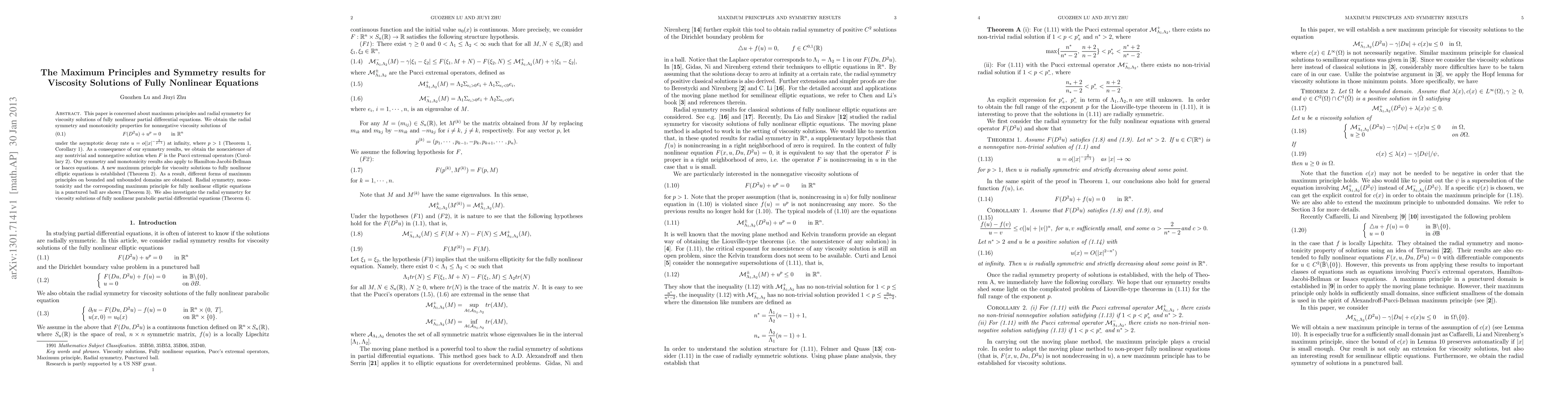 This paper establishes maximum principles and symmetry results for viscosity solutions of fully nonlinear partial differential equations, proving radial symmetry and monotonicity for nonnegative solutions under specific decay conditions. It also demonstrates the nonexistence of nontrivial solutions for certain operators and extends these results to Hamilton-Jacobi-Bellman and Isaacs equations.