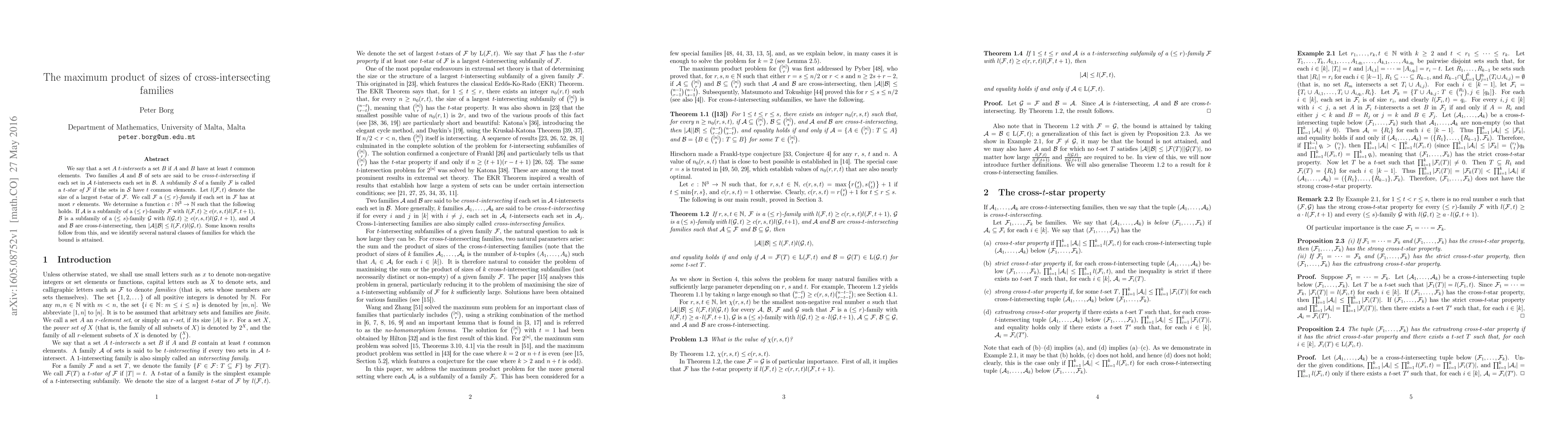 We say that a set $A$ $t$-intersects a set $B$ if $A$ and $B$ have at least $t$ common elements. Two families $\mathcal{A}$ and $\mathcal{B}$ of sets are said to be cross-$t$-intersecting if each set in $\mathcal{A}$ $t$-intersects each set in $\mathcal{B}$. A subfamily $\mathcal{S}$ of a family $\mathcal{F}$ is called a $t$-star of $\mathcal{F}$ if the sets in $\mathcal{S}$ have $t$ common elements. Let $l(\mathcal{F},t)$ denote the size of a largest $t$-star of $\mathcal{F}$. We call $\mathcal{F}$ a $(\leq r)$-family if each set in $\mathcal{F}$ has at most $r$ elements. We determine a function $c : \mathbb{N}^3 \rightarrow \mathbb{N}$ such that the following holds. If $\mathcal{A}$ is a subfamily of a $(\leq r)$-family $\mathcal{F}$ with $l(\mathcal{F},t) \geq c(r,s,t)l(\mathcal{F},t+1)$, $\mathcal{B}$ is a subfamily of a $(\leq s)$-family $\mathcal{G}$ with $l(\mathcal{G},t) \geq c(r,s,t)l(\mathcal{G},t+1)$, and $\mathcal{A}$ and $\mathcal{B}$ are cross-$t$-intersecting, then $|\mathcal{A}||\mathcal{B}| \leq l(\mathcal{F},t)l(\mathcal{G},t)$. Some known results follow from this, and we identify several natural classes of families for which the bound is attained.