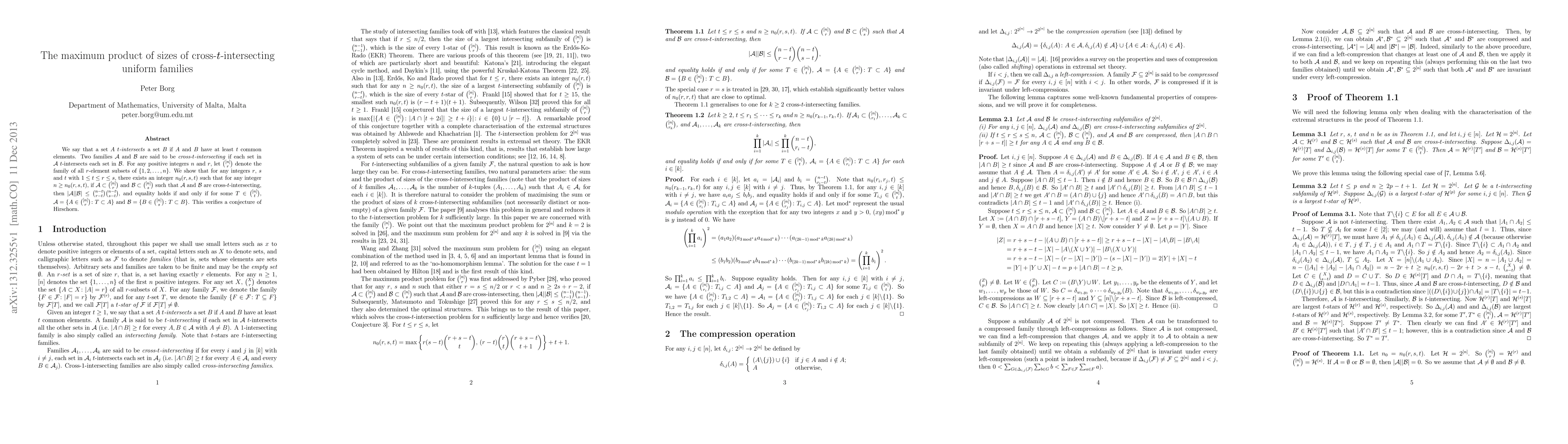 We say that a set $A$ \emph{$t$-intersects} a set $B$ if $A$ and $B$ have at least $t$ common elements. Two families $\mathcal{A}$ and $\mathcal{B}$ are said to be \emph{cross-$t$-intersecting} if each set in $\mathcal{A}$ $t$-intersects each set in $\mathcal{B}$. For any positive integers $n$ and $r$, let ${[n] \choose r}$ denote the family of all $r$-element subsets of $\{1,2,\dots, n\}$. We show that for any integers $r$, $s$ and $t$ with $1 \leq t \leq r \leq s$, there exists an integer $n_0(r,s,t)$ such that for any integer $n \geq n_0(r,s,t)$, if $\mathcal{A} \subset {[n] \choose r}$ and $\mathcal{B} \subset {[n] \choose s}$ such that $\mathcal{A}$ and $\mathcal{B}$ are cross-$t$-intersecting, then $|\mathcal{A}||\mathcal{B}| \leq {n-t \choose r-t}{n-t \choose s-t}$, and equality holds if and only if for some $T \in {[n] \choose t}$, $\mathcal{A} = \{A \in {[n] \choose r} \colon T \subset A\}$ and $\mathcal{B} = \{B \in {[n] \choose s} \colon T \subset B\}$. This verifies a conjecture of Hirschorn.