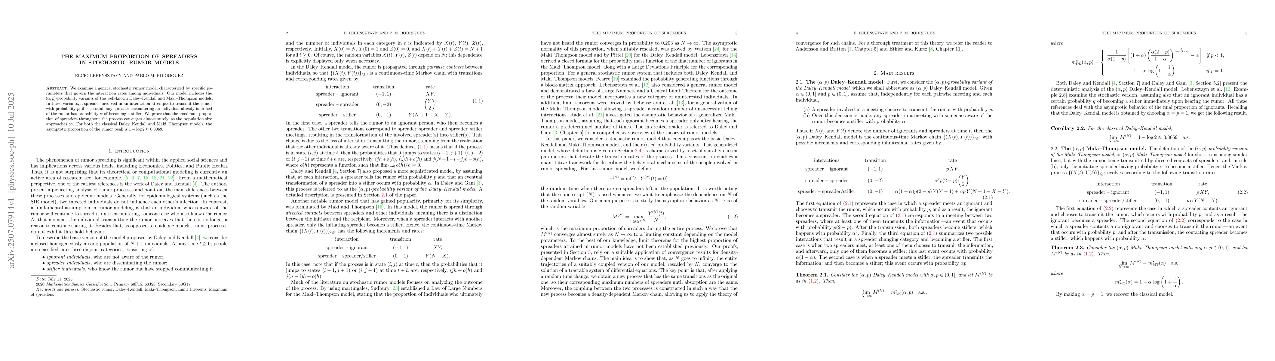 We examine a general stochastic rumor model characterized by specific parameters that govern the interaction rates among individuals. Our model includes the \((\alpha, p)\)-probability variants of the well-known Daley--Kendall and Maki--Thompson models. In these variants, a spreader involved in an interaction attempts to transmit the rumor with probability \(p\); if successful, any spreader encountering an individual already informed of the rumor has probability \(\alpha\) of becoming a stifler. We prove that the maximum proportion of spreaders throughout the process converges almost surely, as the population size approaches~\(\infty\). For both the classical Daley--Kendall and Maki--Thompson models, the asymptotic proportion of the rumor peak is \(1 - \log 2 \approx 0.3069\).