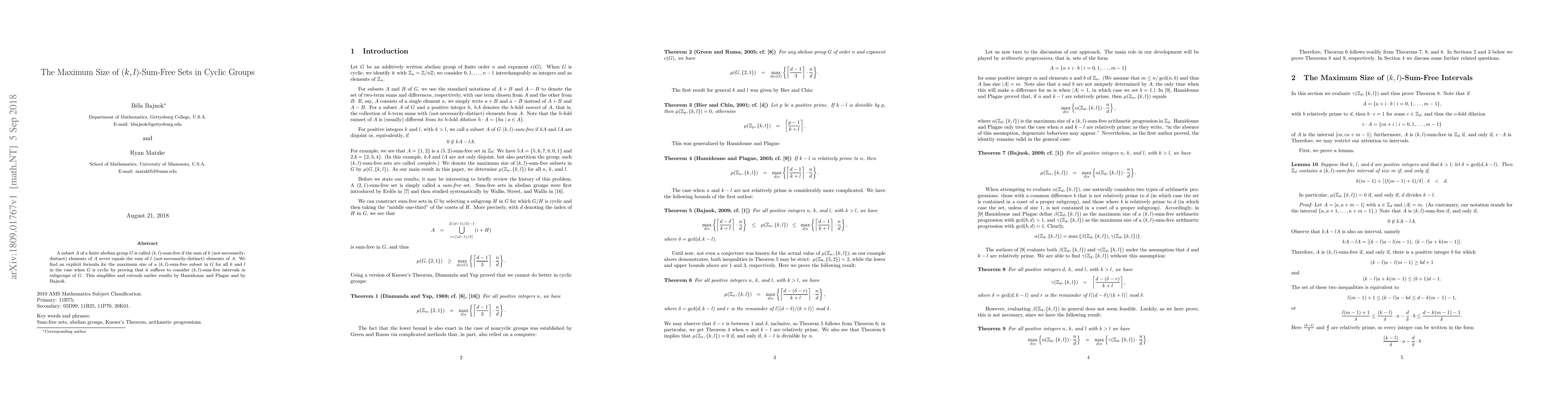 Researchers found an explicit formula for the maximum size of a (k,l)-sum-free subset in cyclic groups, simplifying earlier results by focusing on (k,l)-sum-free intervals in subgroups.