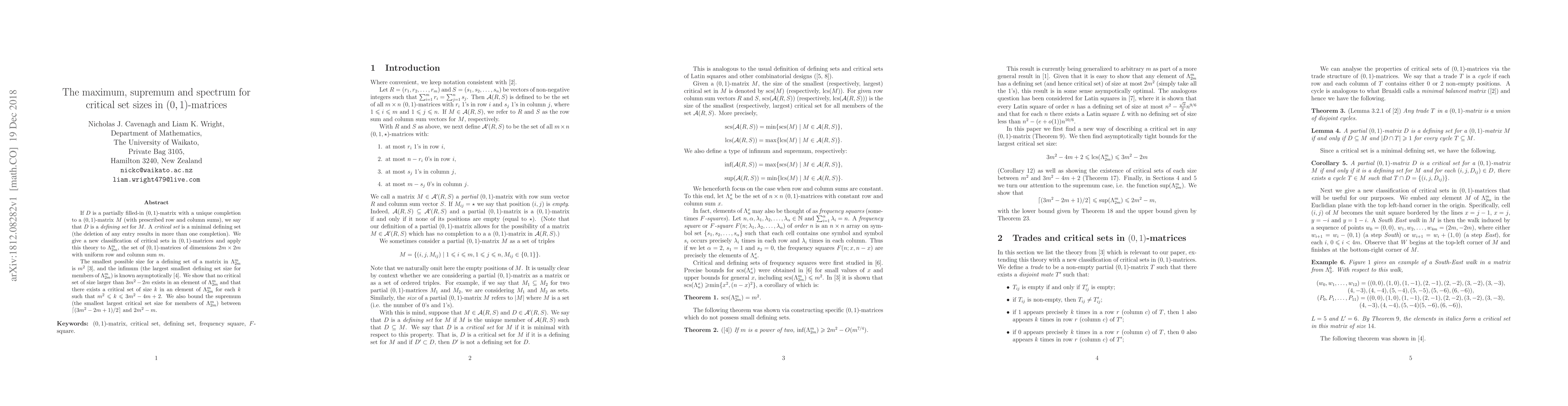If $D$ is a partially filled-in $(0,1)$-matrix with a unique completion to a $(0,1)$-matrix $M$ (with prescribed row and column sums), we say that $D$ is a {\em defining set} for $M$. A {\em critical set} is a minimal defining set (the deletion of any entry results in more than one completion). We give a new classification of critical sets in $(0,1)$-matrices and apply this theory to $\Lambda_{2m}^m$, the set of $(0,1)$-matrices of dimensions $2m\times 2m$ with uniform row and column sum $m$. The smallest possible size for a defining set of a matrix in $\Lambda_{2m}^m$ is $m^2$ \cite{Cav}, and the infimum (the largest smallest defining set size for members of $\Lambda_{2m}^m$) is known asymptotically \cite{CR}. We show that no critical set of size larger than $3m^2-2m$ exists in an element of $\Lambda_{2m}^m$ and that there exists a critical set of size $k$ in an element of $\Lambda_{2m}^m$ for each $k$ such that $m^2\leq k\leq 3m^2-4m+2$. We also bound the supremum (the smallest largest critical set size for members of $\Lambda_{2m}^m$) between $\lceil (3m^2-2m+1)/2\rceil$ and $2m^2-m$.