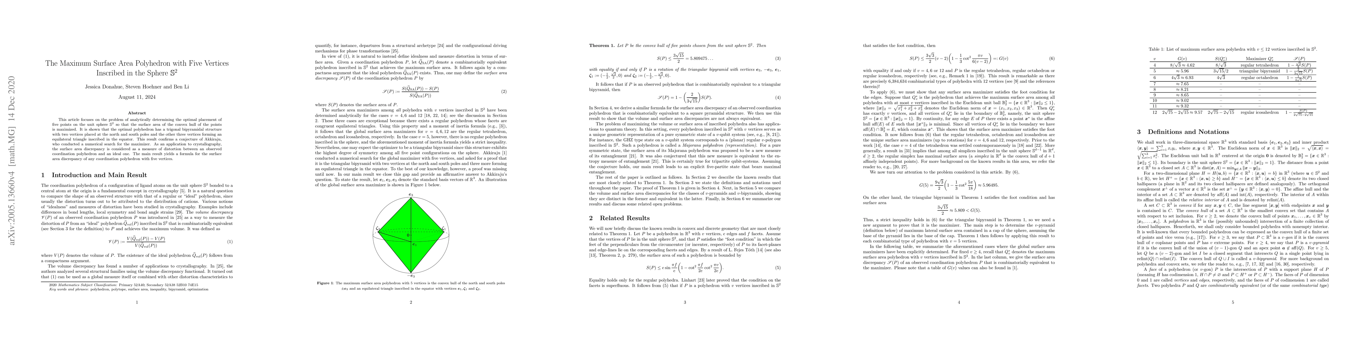 Researchers found that a trigonal bipyramidal polyhedron with 5 vertices inscribed in a unit sphere maximizes surface area, confirming a conjecture. The study also provides a formula for calculating surface area discrepancies in crystallography.