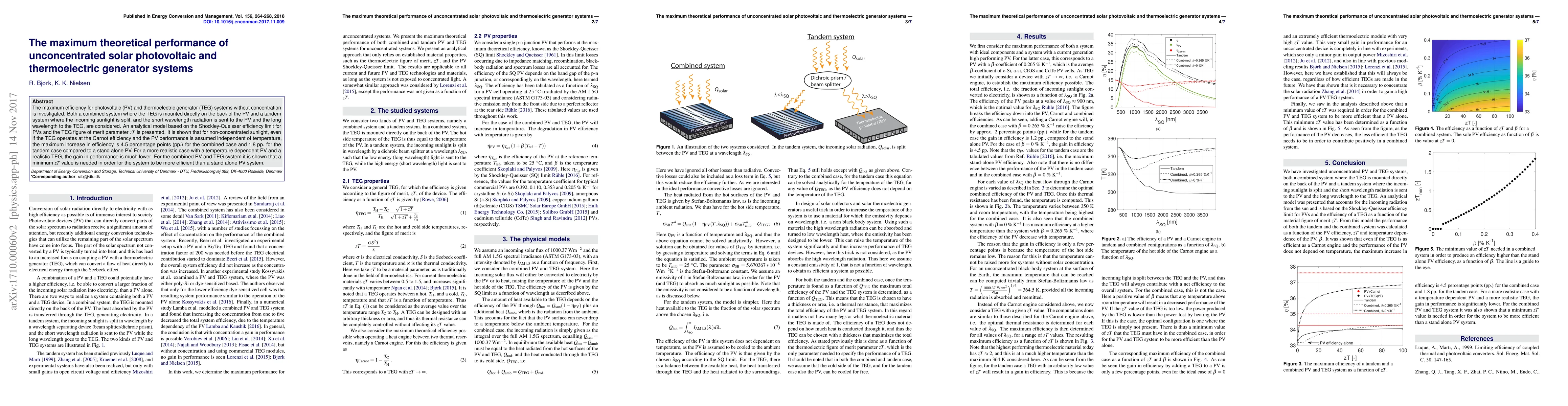 This paper investigates the maximum theoretical efficiency of unconcentrated solar photovoltaic (PV) and thermoelectric generator (TEG) systems, finding that the combined system can increase efficiency by 4.5 percentage points, while the tandem system offers a 1.8 pp. gain. The study concludes that for realistic conditions, the efficiency gains are significantly lower, and a minimum TEG figure of merit is required for the combined system to outperform standalone PV systems.