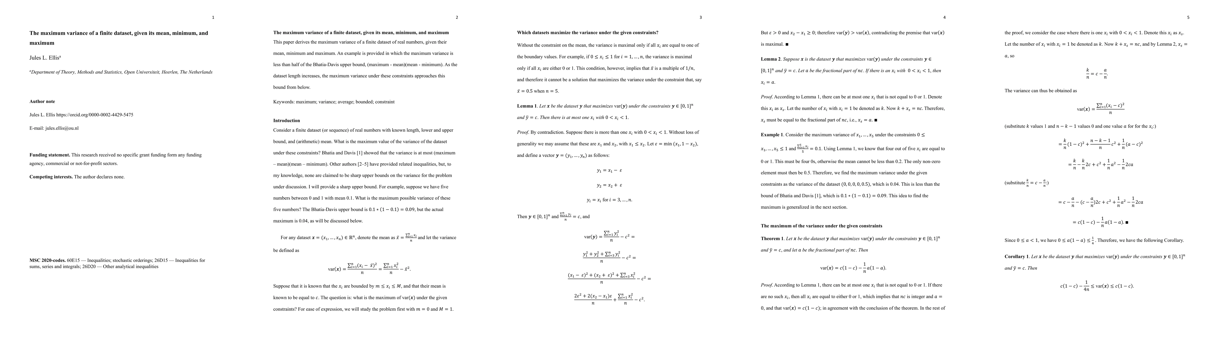 This paper derives the maximum variance of a finite dataset of real numbers, given their mean, minimum and maximum. An example is provided in which the maximum variance is less than half of the Bhatia-Davis upper bound, (maximum - mean)(mean - minimum). As the dataset length increases, the maximum variance under these constraints approaches this bound from below.