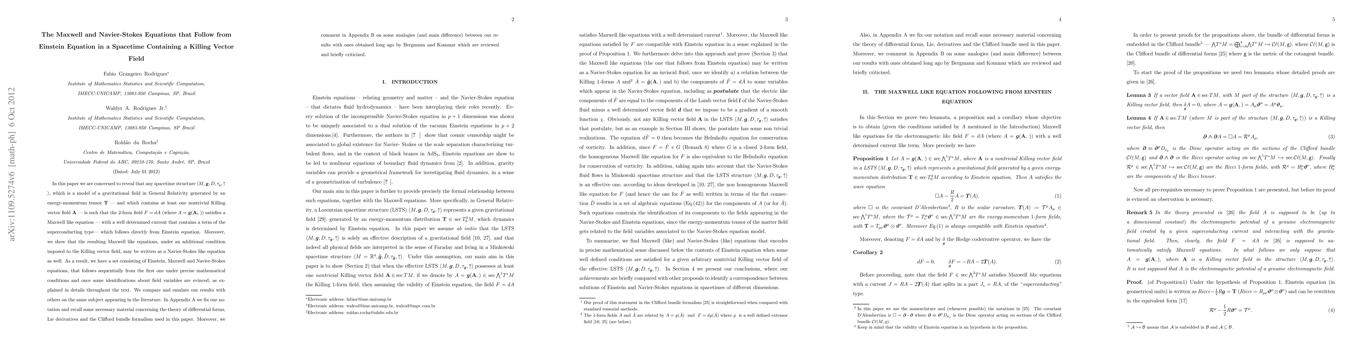 The paper presents a detailed mathematical framework linking Einstein's field equations to Maxwell-like and Navier-Stokes-like equations via Killing vector fields in a spacetime.