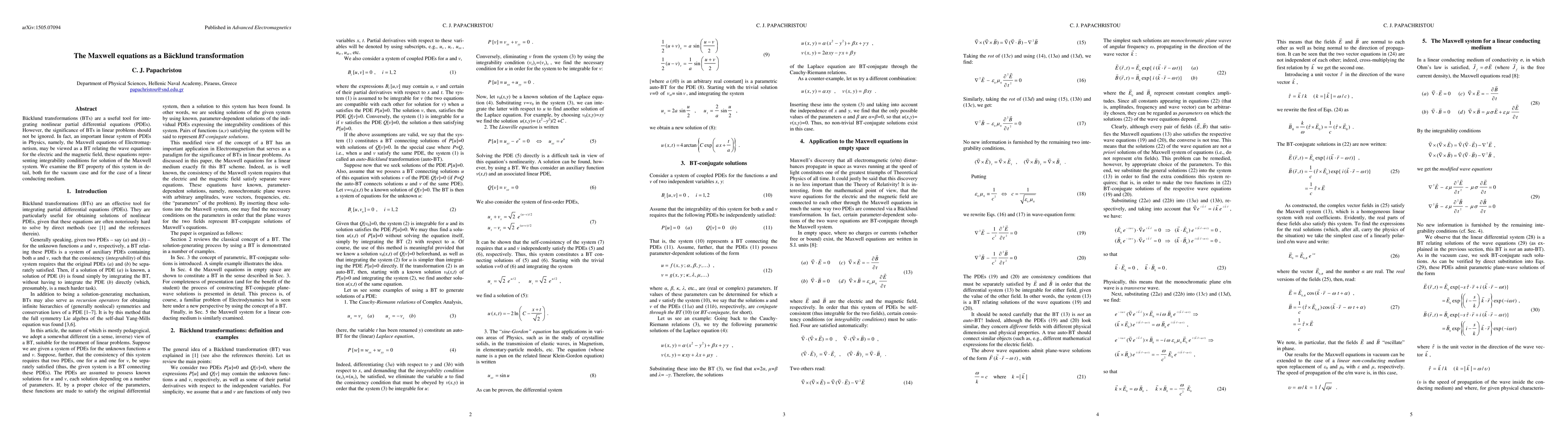 This paper explores how the Maxwell equations, fundamental to electromagnetism, can be interpreted as a Bäcklund transformation, linking the wave equations for electric and magnetic fields. It investigates this property in both vacuum and linear conducting medium scenarios.