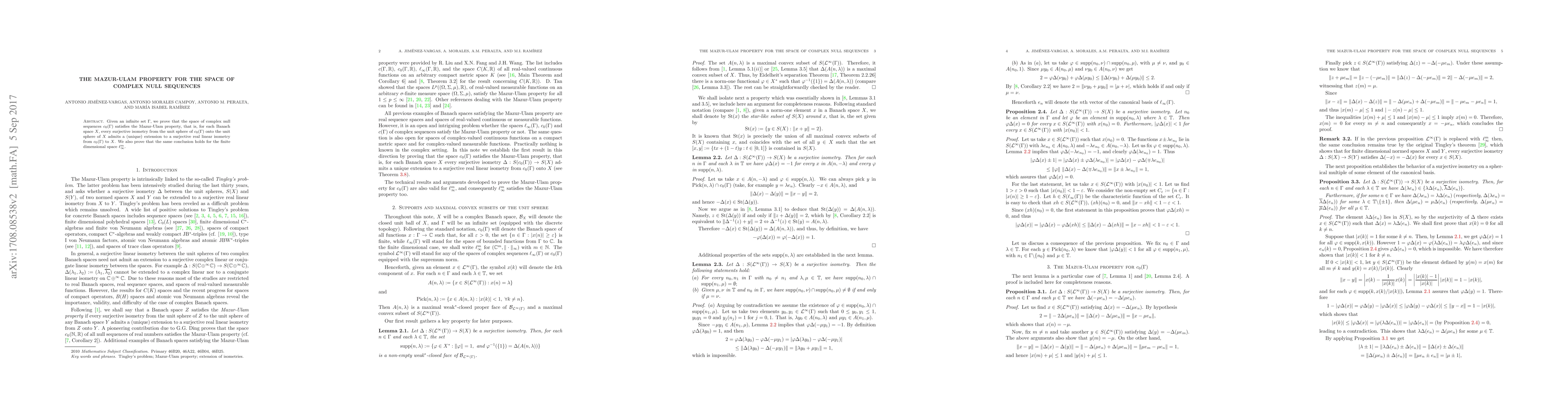 The paper proves that the space of complex null sequences $c_0(\Gamma)$ and the finite-dimensional space $\ell_{\infty}^m$ both satisfy the Mazur-Ulam property, meaning any surjective isometry from their unit spheres can be uniquely extended to a surjective real linear isometry between the spaces.