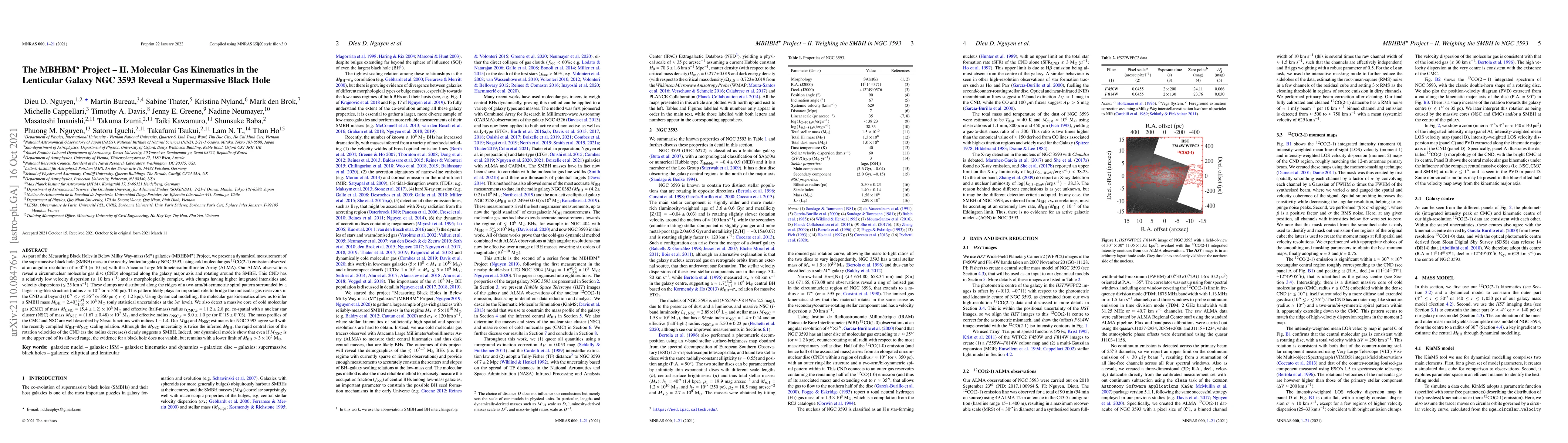 As part of the Measuring Black Holes in Below Milky Way-mass (M$^\star$) galaxies (MBHBM$^\star$) Project, we present a dynamical measurement of the supermassive black hole (SMBH) mass in the nearby lenticular galaxy NGC 3593, using cold molecular gas $^{12}$CO(2-1) emission observed at an angular resolution of $\approx0''.3$ ($\approx10$ pc) with the Atacama Large Millimeter/submillimeter Array (ALMA). Our ALMA observations reveal a circumnuclear molecular gas disc (CND) elongated along the galaxy major axis and rotating around the SMBH. Using dynamical modelling, the molecular gas kinematics allow us to infer a SMBH mass $M_{\rm BH}=2.40_{-1.05}^{+1.87}\times10^6$ M$_\odot$ (only statistical uncertainties at the $3\sigma$ level). We also detect a massive core of cold molecular gas (CMC) of mass $M_{\rm CMC}=(5.4\pm1.2)\times10^6$ M$_\odot$ and effective (half-mass) radius $r_{\rm CMC,e}=11.2\pm2.8$ pc, co-spatial with a nuclear star cluster (NSC) of mass $M_{\rm NSC}=(1.67\pm0.48)\times10^7$ M$_\odot$ and effective radius $r_{\rm NSC,e}=5.0\pm1.0$~pc (or $0''.15\pm0''.03$). The mass profiles of the CMC and NSC are well described by S\'{e}rsic functions with indices $1-1.4$. Our $M_{\rm BH}$ and $M_{\rm NSC}$ estimates for NGC 3593 agree well with the recently compiled $M_{\rm BH}$-$M_{\rm NSC}$ scaling relation. Although the $M_{\rm NSC}$ uncertainty is twice the inferred $M_{\rm BH}$, the rapid central rise of the rotation velocities of the CND (as the radius decreases) clearly suggests a SMBH. Indeed, our dynamical models show that even if $M_{\rm NSC}$ is at the upper end of its allowed range, the evidence for a black hole does not vanish, but remains with a lower limit of $M_{\rm BH}>3\times10^5$ M$_\odot$.