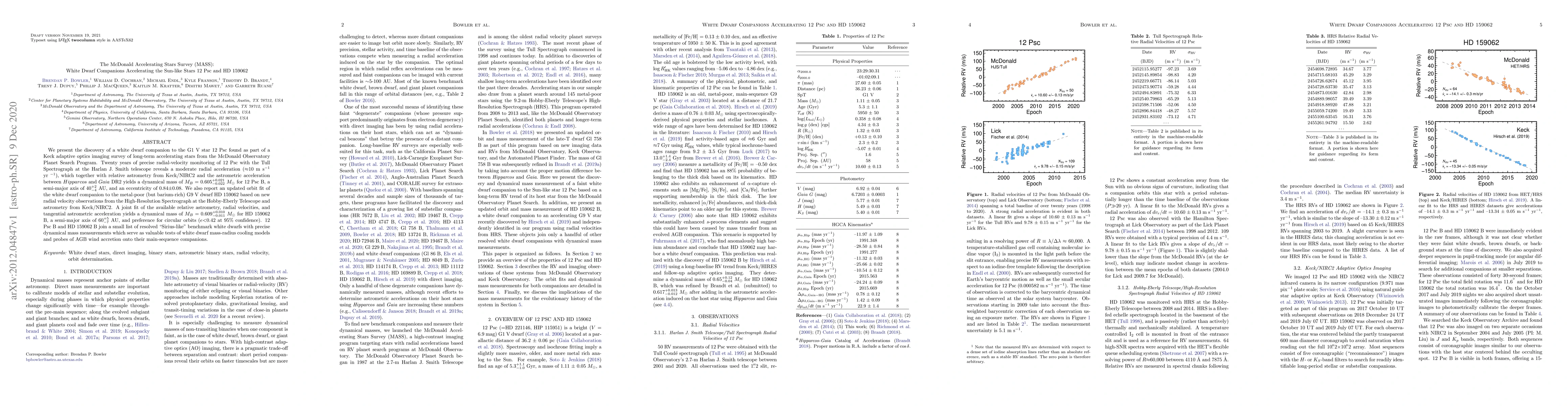 The McDonald Accelerating Stars Survey (MASS) discovered white dwarf companions to the G1 V star 12 Psc and the G9 V star HD 159062, providing precise dynamical masses and orbits for these systems. These white dwarfs contribute to benchmark data for white dwarf mass-radius models and AGB wind accretion studies.