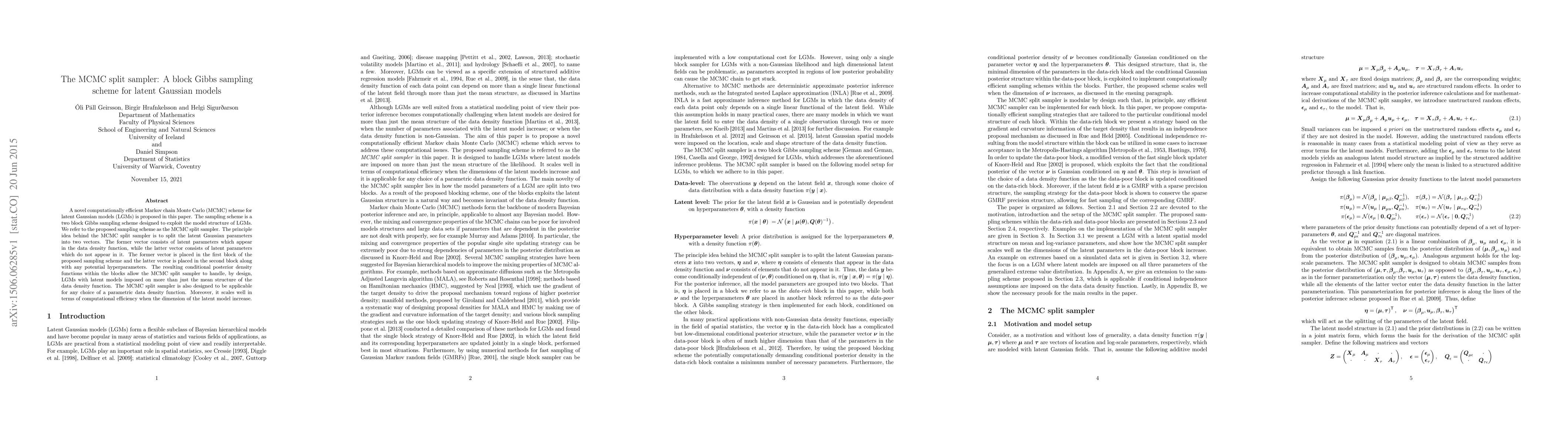 This paper introduces the MCMC split sampler, a two-block Gibbs sampling scheme for latent Gaussian models, designed to efficiently exploit model structure and handle complex latent models beyond mean structure. It scales well computationally with increasing latent model dimensions.