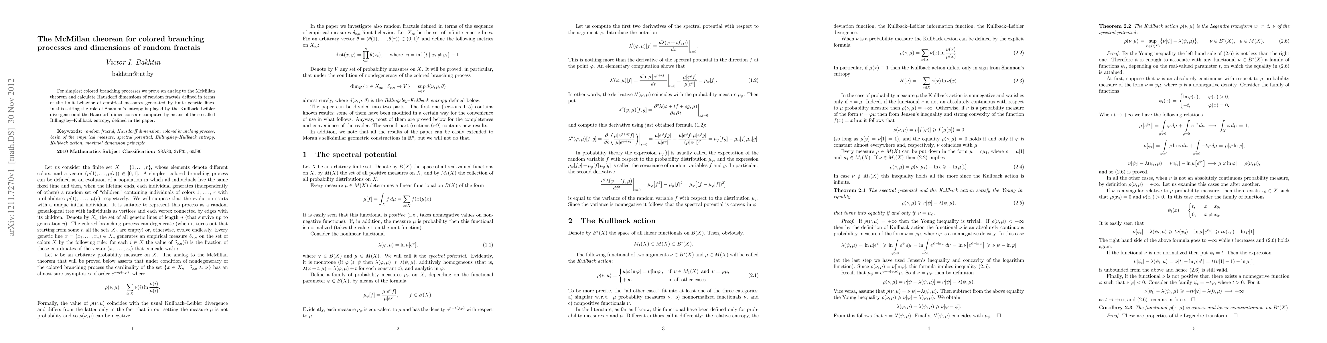 For simplest colored branching processes we prove an analog to the McMillan theorem and calculate Hausdorff dimensions of random fractals defined in terms of the limit behavior of empirical measures generated by finite genetic lines. In this setting the role of Shannon's entropy is played by the Kullback--Leibler divergence and the Hausdorff dimensions are computed by means of the so-called Billingsley--Kullback entropy, defined in the paper.