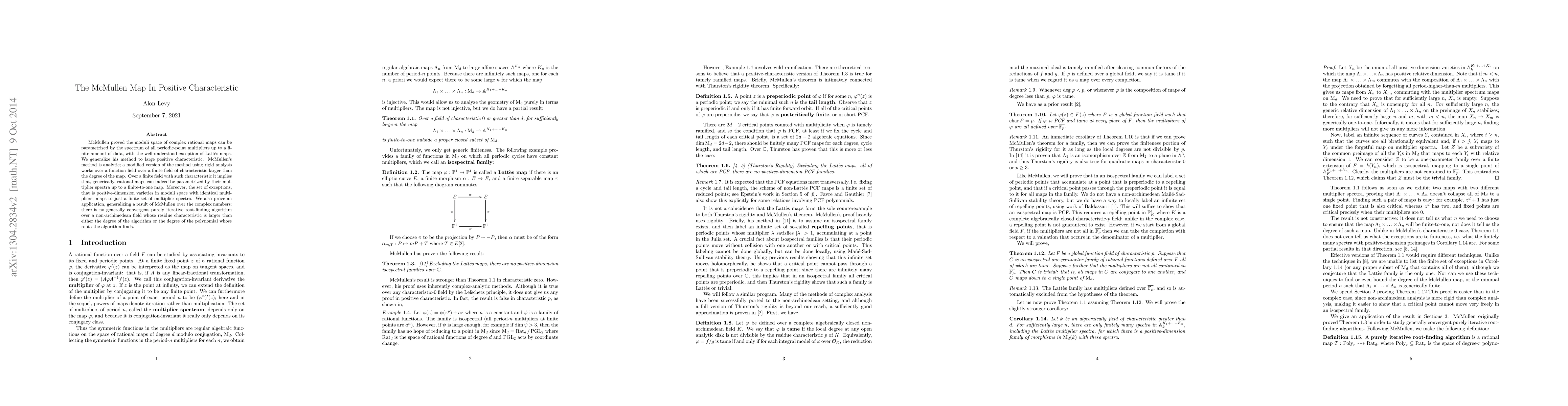 This paper generalizes McMullen's method for parametrizing moduli space of rational maps to positive characteristic fields, showing that rational maps can be parametrized by their multiplier spectra generically, with exceptions mapping to a finite set of spectra. It also proves that no generally convergent iterative root-finding algorithm exists over non-archimedean fields with residue characteristic larger than the algorithm or polynomial degree.