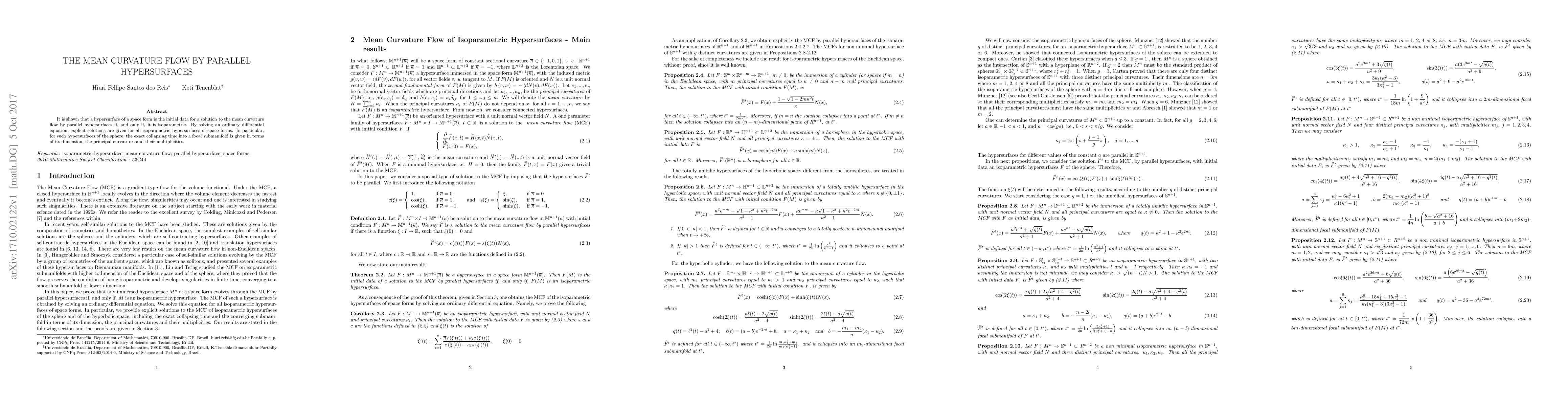 This paper demonstrates that a hypersurface in a space form is an initial condition for a mean curvature flow by parallel hypersurfaces if and only if it is isoparametric. Explicit solutions for these isoparametric hypersurfaces are derived, with particular focus on the exact collapsing time for spherical hypersurfaces.