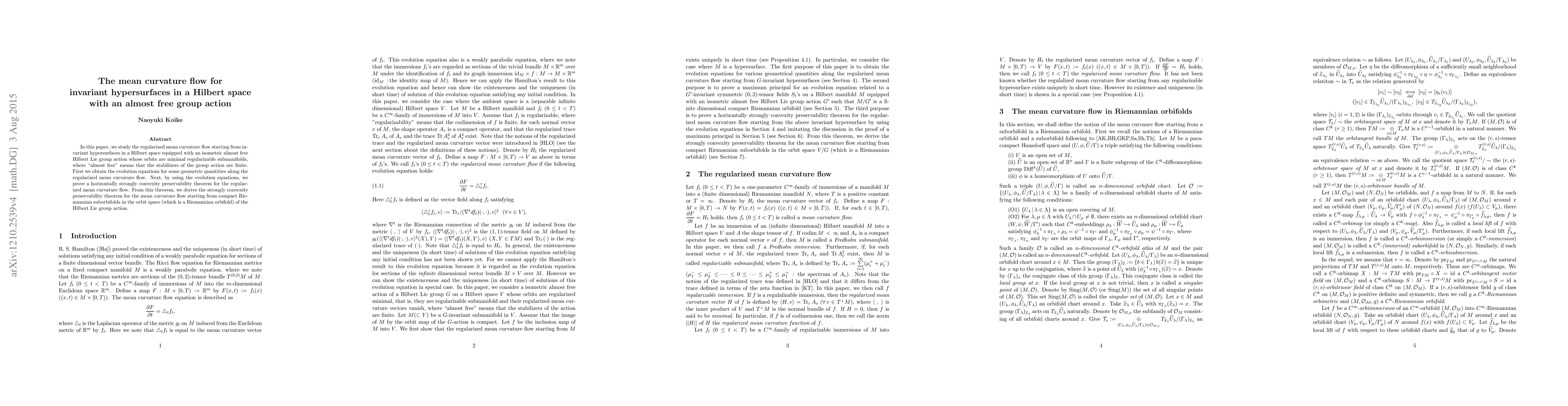 In this paper, we study the regularized mean curvature flow starting from invariant hypersurfaces in a Hilbert space equipped with an isometric almost free Hilbert Lie group action whose orbits are minimal regularizable submanifolds, where "almost free" means that the stabilizers of the group action are finite. First we obtain the evolution equations for some geometric quantities along the regularized mean curvature flow. Next, by using the evolution equations, we prove a horizontally strongly convexity preservability theorem for the regularized mean curvature flow. From this theorem, we derive the strongly convexity preservability theorem for the mean curvature flow starting from compact Riemannian suborbifolds in the orbit space (which is a Riemannian orbifold) of the Hilbert Lie group action.