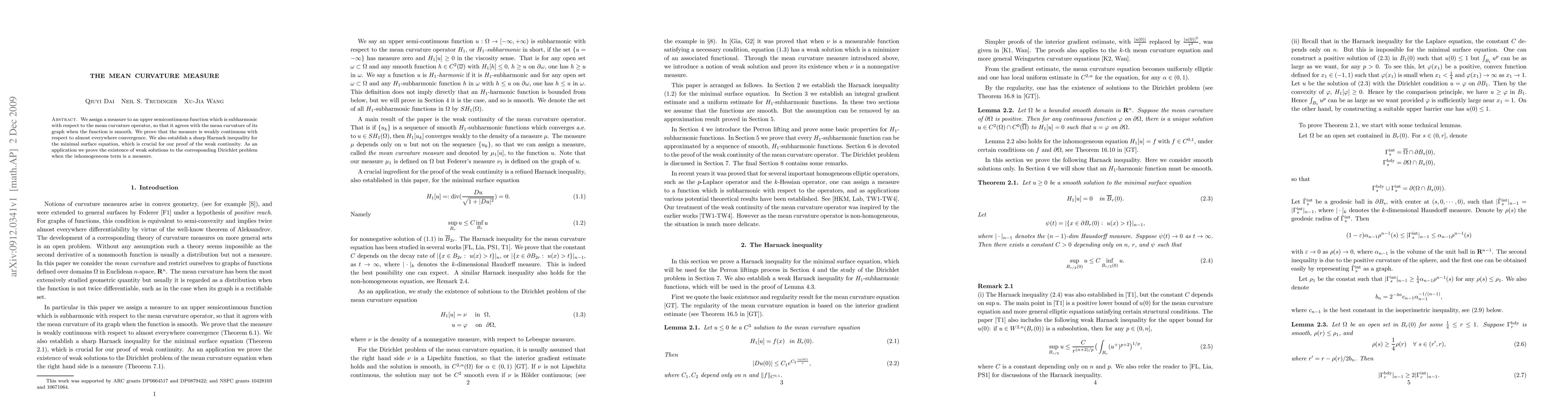 We assign a measure to an upper semicontinuous function which is subharmonic with respect to the mean curvature operator, so that it agrees with the mean curvature of its graph when the function is smooth. We prove that the measure is weakly continuous with respect to almost everywhere convergence. We also establish a sharp Harnack inequality for the minimal surface equation, which is crucial for our proof of the weak continuity. As an application we prove the existence of weak solutions to the corresponding Dirichlet problem when the inhomogeneous term is a measure.