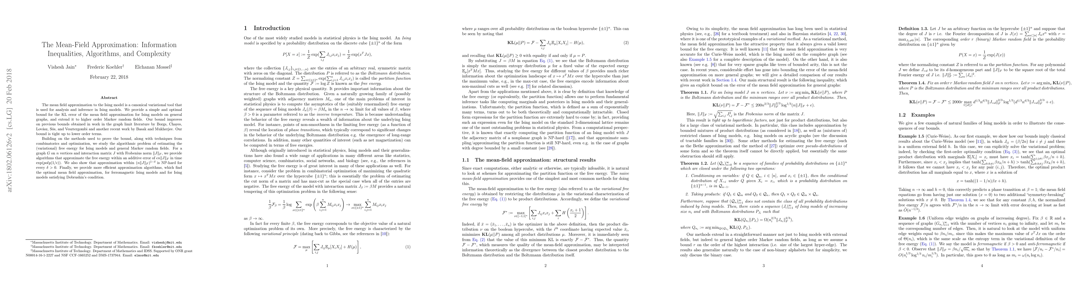 This paper presents an optimal bound for the KL error of the mean field approximation in Ising models and higher order Markov random fields, improving upon previous results. It also develops efficient algorithms for approximating the variational free energy and proves the NP-hardness of certain approximation problems.
