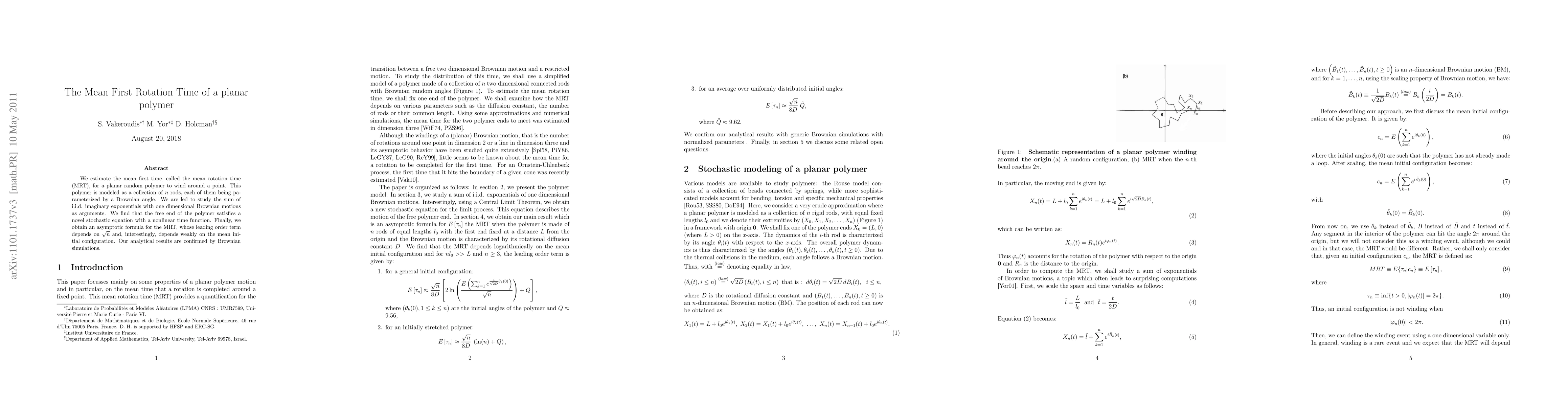 We estimate the mean first time, called the mean rotation time (MRT), for a planar random polymer to wind around a point. This polymer is modeled as a collection of n rods, each of them being parameterized by a Brownian angle. We are led to study the sum of i.i.d. imaginary exponentials with one dimensional Brownian motions as arguments. We find that the free end of the polymer satisfies a novel stochastic equation with a nonlinear time function. Finally, we obtain an asymptotic formula for the MRT, whose leading order term depends on the square root of n and, interestingly, depends weakly on the mean initial configuration. Our analytical results are confirmed by Brownian simulations.Our analytical results are confirmed by Brownian simulations.