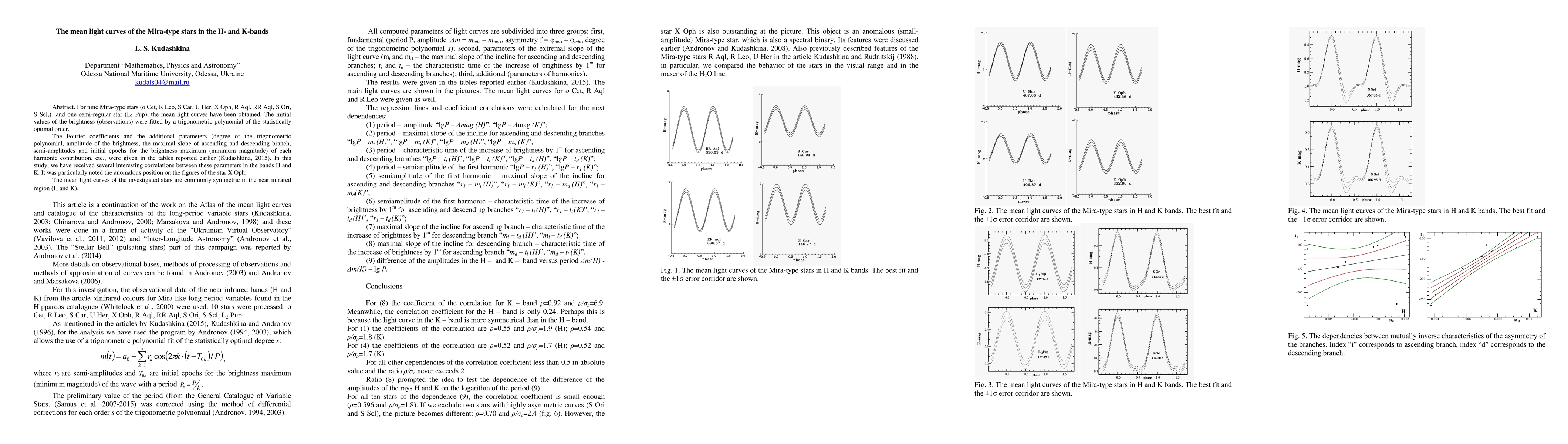 For nine Mira-type stars (o Cet, R Leo, S Car, U Her, X Oph, R Aql, RR Aql, S Ori, S Scl,) and one semi-regular star (L2 Pup), the mean light curves have been obtained. The initial values of the brightness (observations) were fitted by a trigonometric polynomial of the statistically optimal order. The Fourier coefficients and the additional parameters (degree of the trigonometric polynomial, amplitude of the brightness, the maximal slope of ascending and descending branch, semi-amplitudes and initial epochs for the brightness maximum (minimum magnitude) of each harmonic contribution, etc., were given in the tables reported earlier (Kudashkina, 2015). In this study, we have received several interesting correlations between these parameters in the bands H and K. It was particularly noted the anomalous position on the figures of the star X Oph. The mean light curves of the investigated stars are commonly symmetric in the near infrared region (H and K).