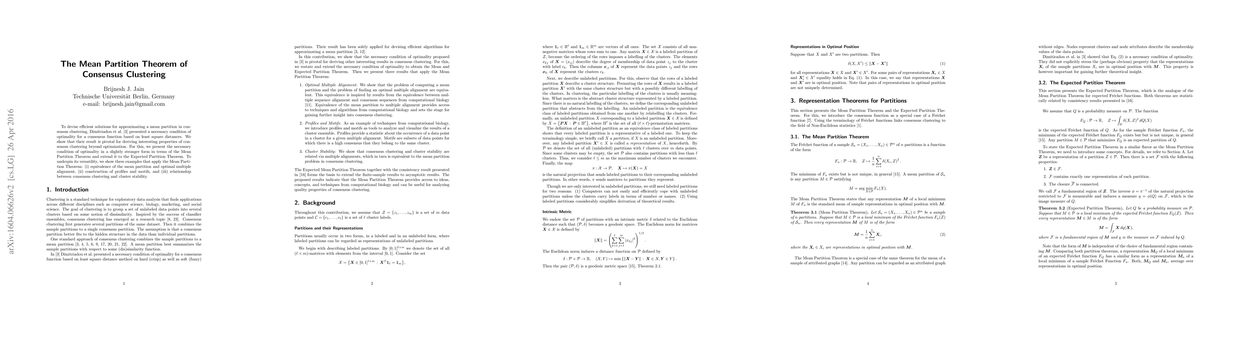 The Mean Partition Theorem of consensus clustering provides a stronger necessary condition of optimality for consensus functions, extending it to the Expected Partition Theorem and demonstrating its applications in multiple alignment, profile construction, and cluster stability. This theorem enhances the understanding of consensus clustering beyond mere optimization.