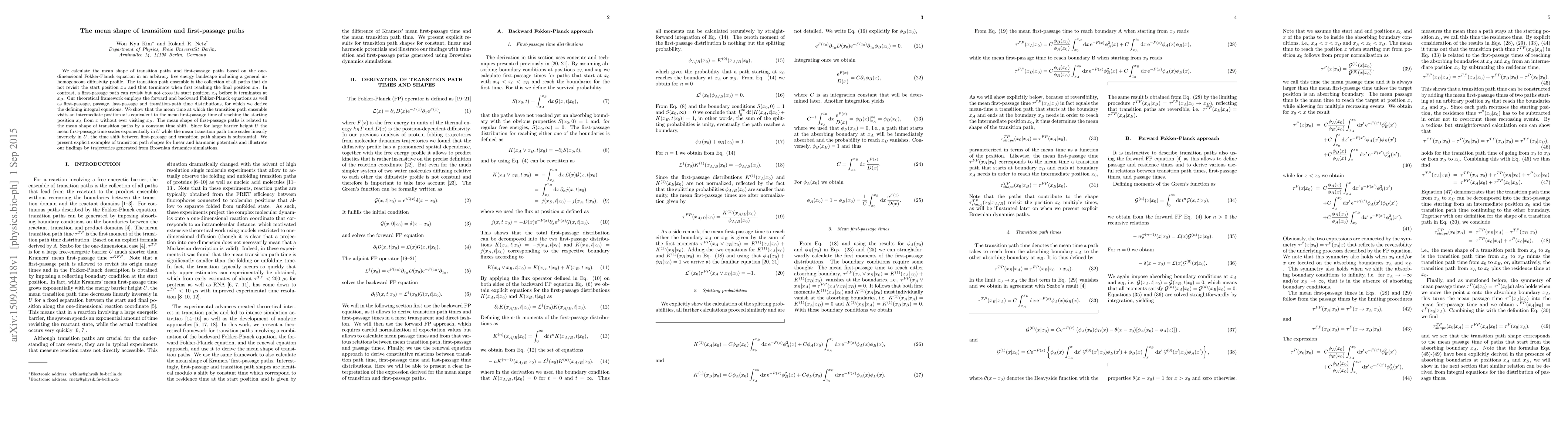 This paper calculates the mean shapes of transition and first-passage paths in a one-dimensional Fokker-Planck framework, revealing that the mean time of transition paths corresponds to the mean first-passage time to the start position without revisiting it. The mean shape of first-passage paths is a time-shifted version of transition paths, with a significant time difference for large barrier heights.