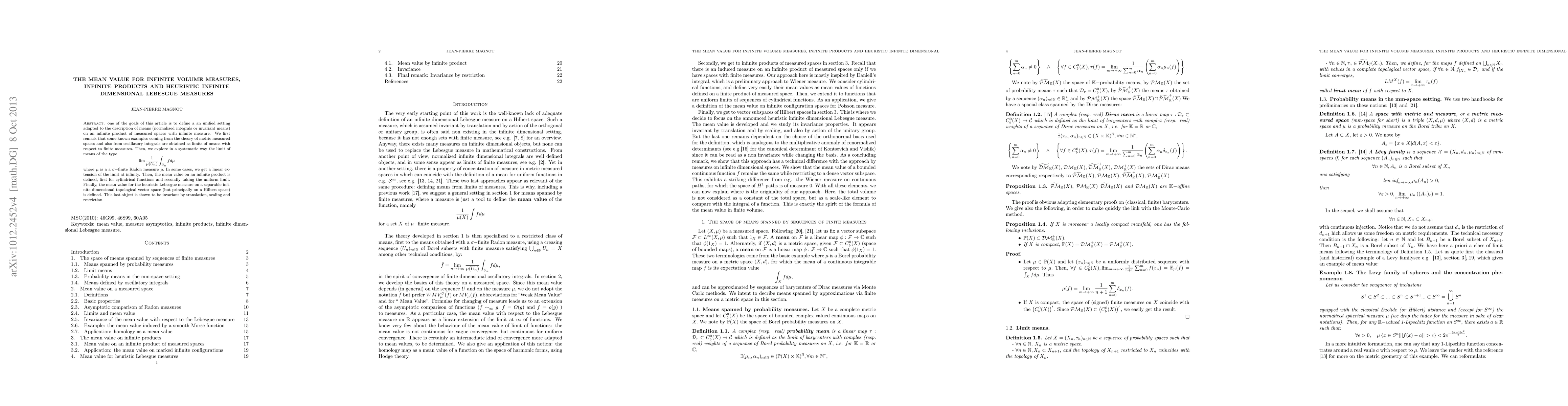 One of the goals of this article is to define a an unified setting adapted to the description of means (normalized integrals or invariant means) on an infinite product of measured spaces with infinite measure. We first remark that some known examples coming from the theory of metric measured spaces and also from oscillatory integrals are obtained as limits of means with respect to finite measures. Then, we explore in a systematic way the limit of means of the type $$ \lim \frac{1}{\mu(U_n)} \int_{U_n} f d\mu$$ where $\mu$ is a a $\sigma-$finite Radon measure $\mu.$ In some cases, we get a linear extension of the limit at infinity. Then, the mean value on an infinite product is defined, first for cylindrical functions and secondly taking the uniform limit. Finally, the mean value for the heuristic Lebesgue measure on a separable infinite dimensional topological vector space (but principally on a Hilbert space) is defined. This last object is shown to be invariant by translation, scaling and restriction.