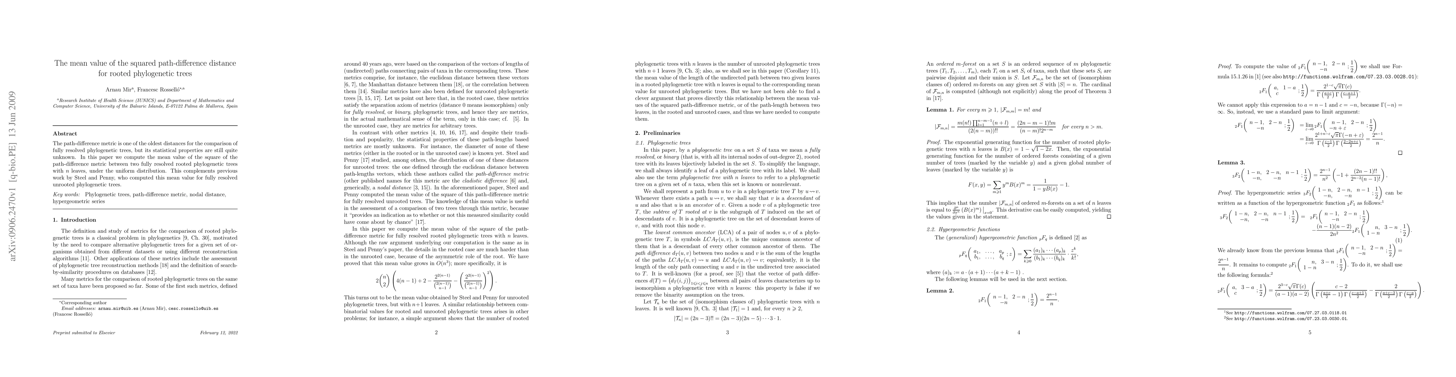 This paper calculates the mean value of the squared path-difference metric for fully resolved rooted phylogenetic trees, filling a gap in statistical properties knowledge. It complements Steel and Penny's prior work on unrooted trees.