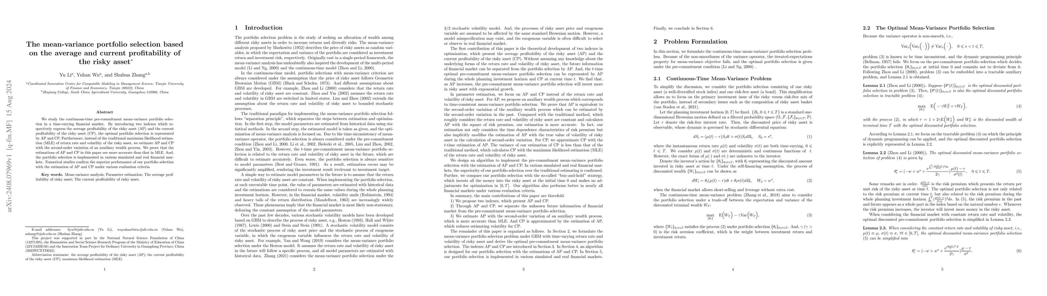 This paper develops a continuous-time mean-variance portfolio selection model using average profitability (AP) and current profitability (CP) indexes for a time-varying financial market, offering a more accurate estimation method than traditional maximum likelihood estimation. The proposed model's performance is validated through simulations and real market data, demonstrating superior portfolio selection outcomes.