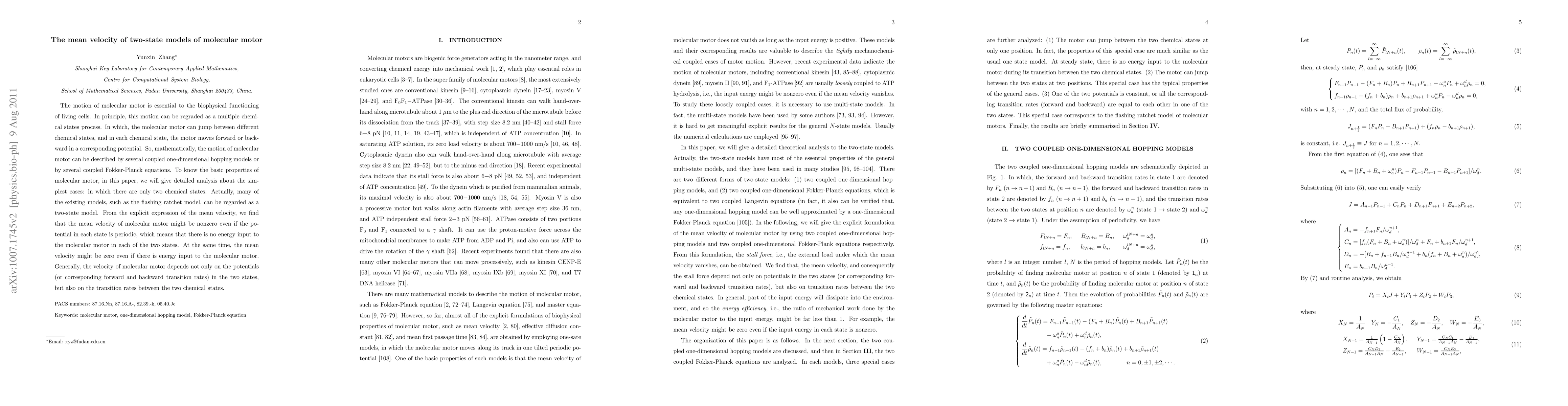 This paper analyzes the mean velocity of molecular motors in two-state models, showing that mean velocity can be nonzero even without energy input in each state, and vice versa. The motor's velocity depends on both the potentials in each state and the transition rates between states.