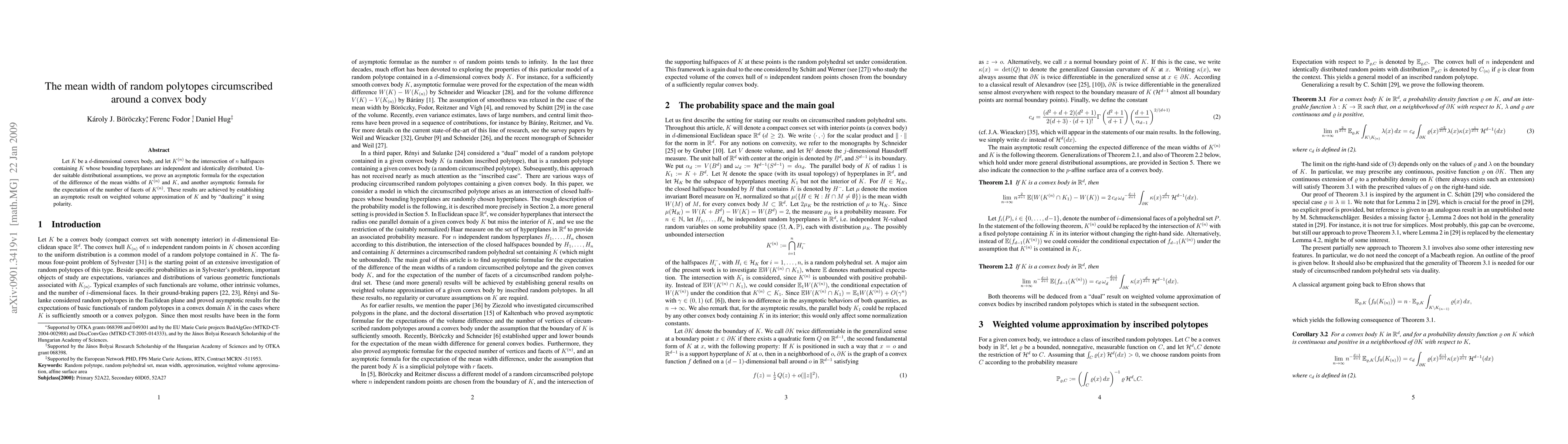 Let K be a d-dimensional convex body, and let $K^{(n)}$ be the intersection of n halfspaces containing $K$ whose bounding hyperplanes are independent and identically distributed. Under suitable distributional assumptions, we prove an asymptotic formula for the expectation of the difference of the mean widths of $K^{(n)}$ and K, and another asymptotic formula for the expectation of the number of facets of $K^{(n)}$. These results are achieved by establishing an asymptotic result on weighted volume approximation of $K$ and by "dualizing" it using polarity.