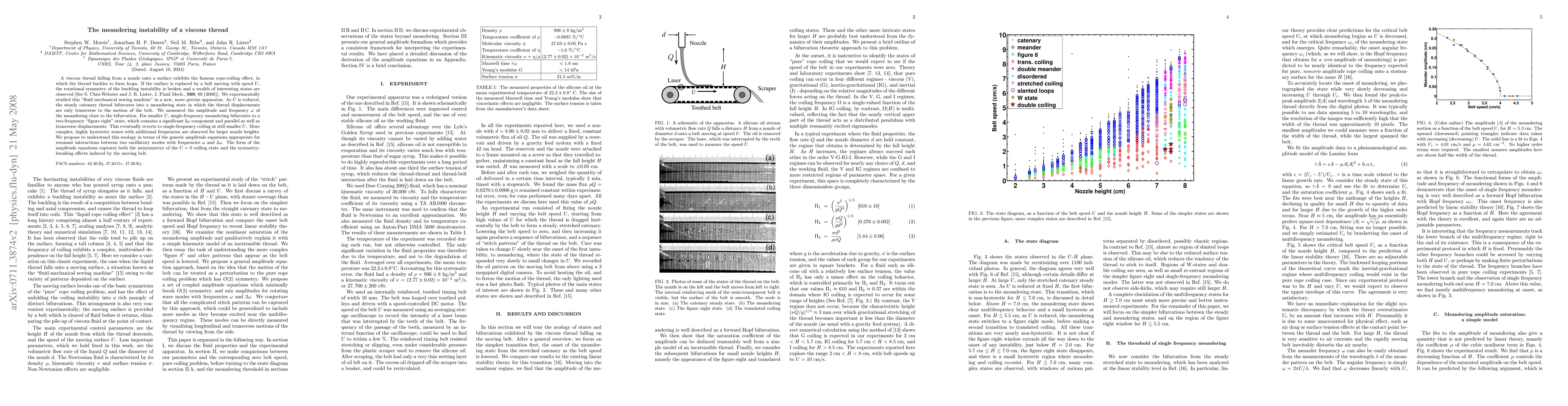 A viscous thread falling from a nozzle onto a surface exhibits the famous rope-coiling effect, in which the thread buckles to form loops. If the surface is replaced by a belt moving with speed $U$, the rotational symmetry of the buckling instability is broken and a wealth of interesting states are observed [See S. Chiu-Webster and J. R. Lister, J. Fluid Mech., {\bf 569}, 89 (2006)]. We experimentally studied this "fluid mechanical sewing machine" in a new, more precise apparatus. As $U$ is reduced, the steady catenary thread bifurcates into a meandering state in which the thread displacements are only transverse to the motion of the belt. We measured the amplitude and frequency $\omega$ of the meandering close to the bifurcation. For smaller $U$, single-frequency meandering bifurcates to a two-frequency "figure eight" state, which contains a significant $2\omega$ component and parallel as well as transverse displacements. This eventually reverts to single-frequency coiling at still smaller $U$. More complex, highly hysteretic states with additional frequencies are observed for larger nozzle heights. We propose to understand this zoology in terms of the generic amplitude equations appropriate for resonant interactions between two oscillatory modes with frequencies $\omega$ and $2\omega$. The form of the amplitude equations captures both the axisymmetry of the U=0 coiling state and the symmetry-breaking effects induced by the moving belt.