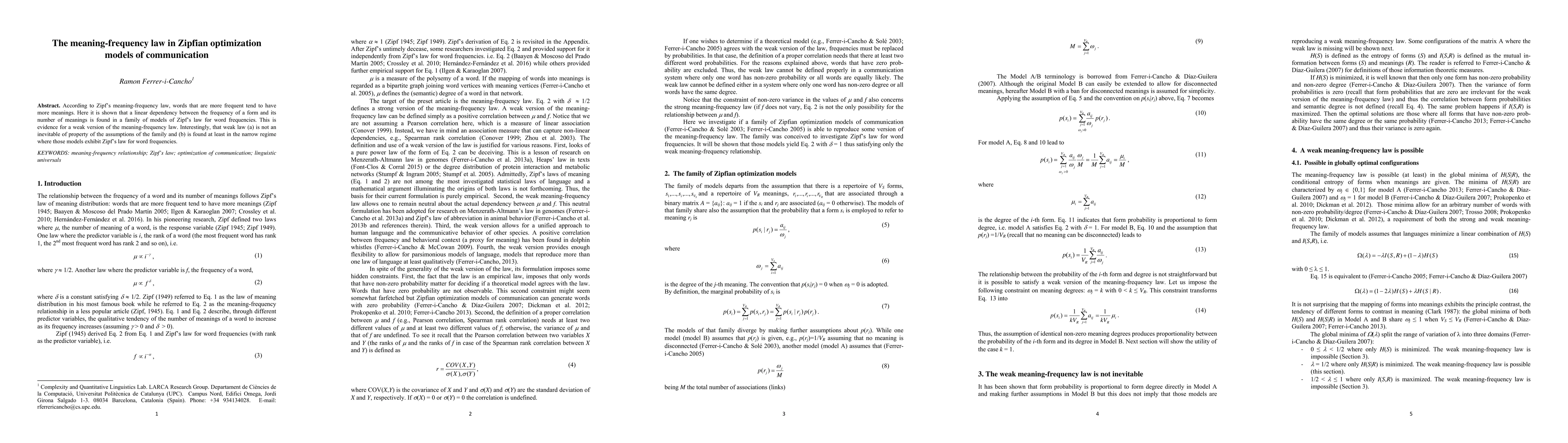 This research explores Zipf's meaning-frequency law, finding a linear relationship between word frequency and meanings in a family of Zipf's law models. The law's weak form emerges only in the specific frequency regime where these models adhere to Zipf's law, suggesting it's not an automatic model property.