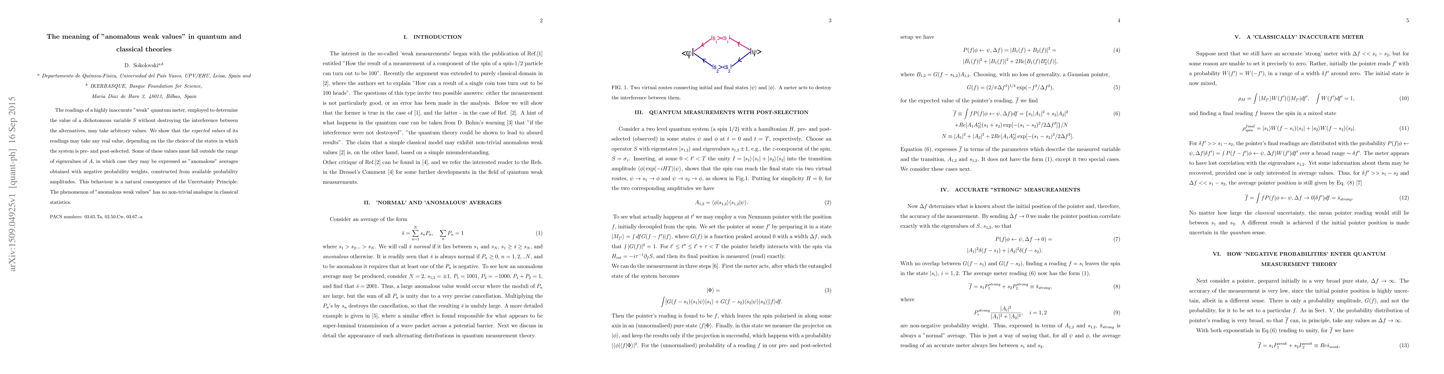 The readings of a highly inaccurate "weak" quantum meter, employed to determine the value of a dichotomous variable $S$ without destroying the interference between the alternatives,may take arbitrary values. We show that the expected values of its readings may take any real value, depending on the the choice of the states in which the system is pre- and post-selected. Some of these values must fall outside the range of eigenvalues of $A$, in which case they may be expressed as "anomalous" averages obtained with negative probability weights, constructed from available probability amplitudes. This behaviour is a natural consequence of the Uncertainty Principle. The phenomenon of "anomalous weak values" has no non-trivial analogue in classical statistics.